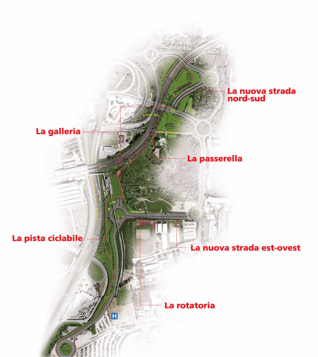 —> una rotatoria metterà in relazione la strada Est-Ovest con la strada Nord-Sud in corrispondenza dell’uscita lato sud del tunnel di quest’ultima. La rotatoria è ribassata rispetto al livello del terreno ed è attraversata dal viadotto del micro metrò Gobba-San Raffaele.