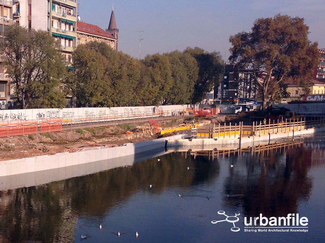 Tornando al cantiere, per i prossimi mesi una diga proteggerà i lavori in corso alle sponde delle banchine, creando una sorta di trincea per permettere ai carpentieri di definire i muri. In questo settore del cantiere sorgerà il Mercato coperto che è previsto venga aperto entro la prima metà del 2014 (poi si procederà con l’abbattimento di quello vecchio). Per la sua realizzazione era previsto l’abbattimento di un platano molto alto e a tal proposito ho potuto anche assistere al suo taglio, l’unico platano grosso che verrà sacrificato (saranno ripiantati altri 9 platani nella piazza nuova), devo dire che un po’ mi si è stretto il cuore a tale vista. Siamo certi che questo vecchio platano, da buon milanese, sarà felice di essersi sacrificato per permettere una sistemazione che la nostra città aspettava da troppo tempo.