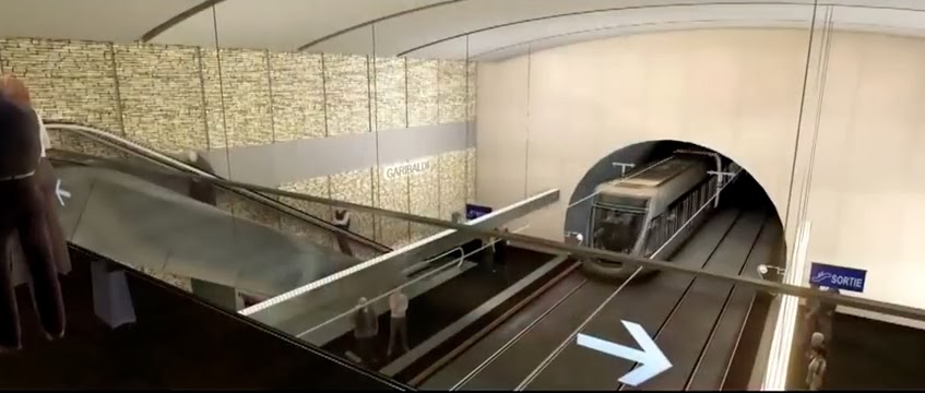 2′ 02” – Sorpresa: il tram entra in una galleria sotterranea e ferma in una stazione molta ampia e bella, che nulla ha da invidiare alle stazioni metropolitane, e si chiama Garibaldi (!!!) Un ottimo esempio di scambio intermodale. La stazione appare molto graziosa e i rivestimenti delle pareti apprezzabili e “caldi”.