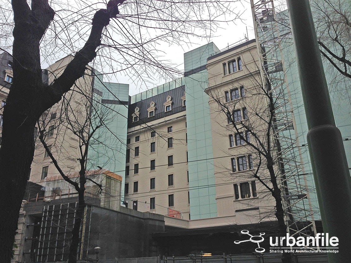 Un intervento così importante, sia per la storia dell’edificio che per la sua posizione, non può non essere comentato frequentemente. Manca ormai poco alla conclusione dei lavori, duranti più di quanto ci si aspettava, e il nuovo aspetto dell’ala più recente dello storico hotel convince solo in parte. Rimangono infatti non risolte alcune criticità: in primo luogo, l’ingombrante soluzione di copertura pare rialzata di un piano rispetto ai rendering; la scelta del colore, una tonalità di verde acqua, per alcune vetrate, appare a mio avviso poco convincente, in particolare sul retro del palazzo (in affaccio su Via Filzi) dove intere pareti di queste pannellature in vetro verdino schermano alla vista spazi tecnici; infine sulla copertura dell’ala storica è comparsa una struttura in vetro verdino e metallo che fa capolino osservando il fronte dalla piazza: forse si poteva trovare una soluzione meno impattante.