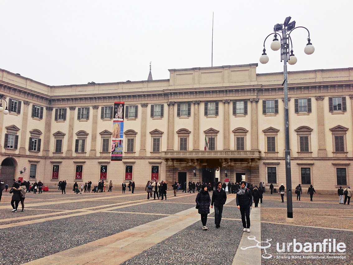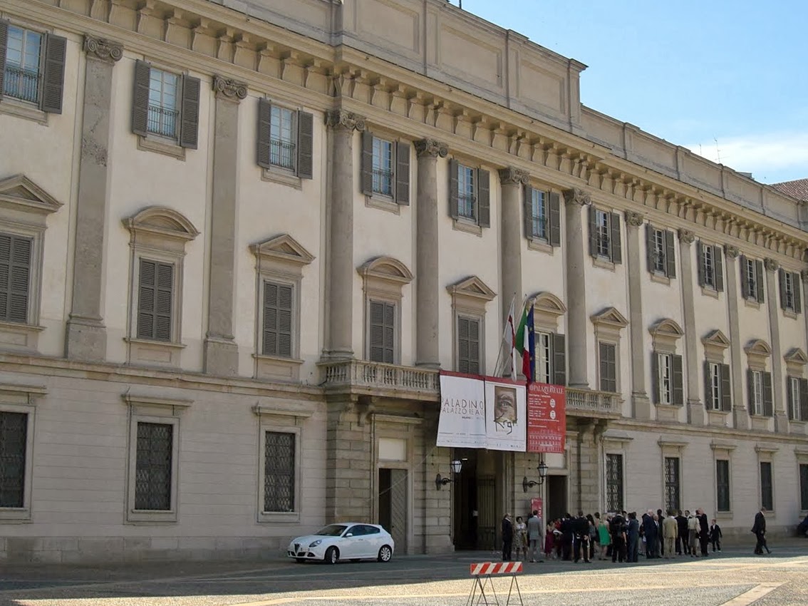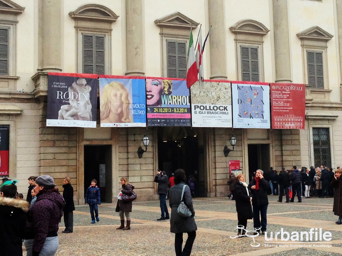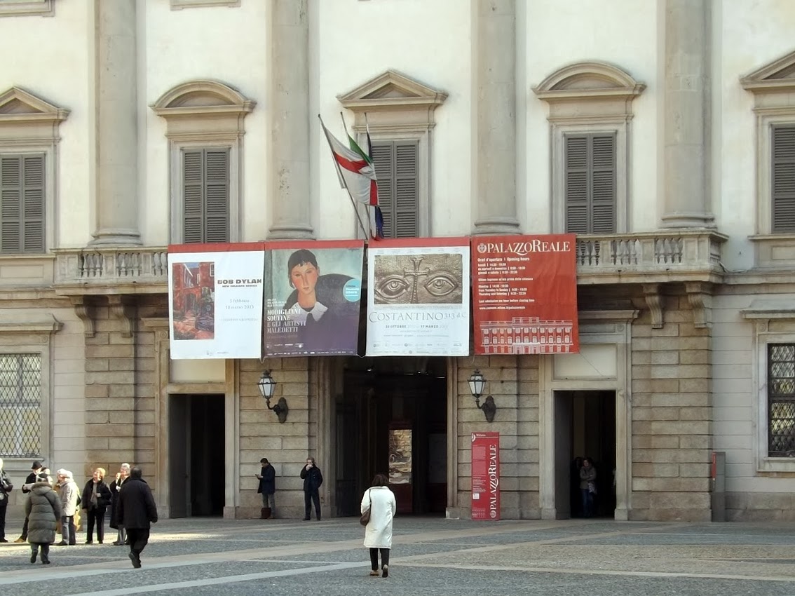 Possibile che non esistano altre forme più eleganti per segnalare ed informare? Questi dozzinali cartelli coprono troppo spesso la bella balconata, snaturandone la bellezza e non sono per nulla in armonia con ciò che questo edificio storicamente e artisticamente rappresenta. Se si usassero invece gonfaloni appesi in facciata come troviamo presso l’Ambrosiana (vedi foto qui in fondo)? O magari dei totem piazzati in un punto strategico della Piazzetta Reale?