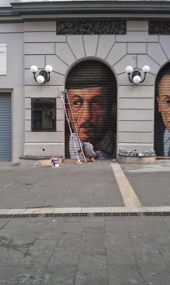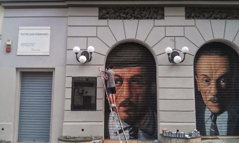 Eduardo De Filippo ripreso tra le scene più famose di alcune Sue commedie e impresse nelle saracinesche del Suo Teatro per ricordarne i trent’anni dalla sua morte. E così, la Sua città, lo ha voluto ricordare in chiave street art, con nove giorni di lavoro di Jorit Agoch, famoso graffitista italo-Olandese nato e cresciuto nella città Partenopea. L’iniziativa rientra in quelle organizzate per il Forum delle Culture.