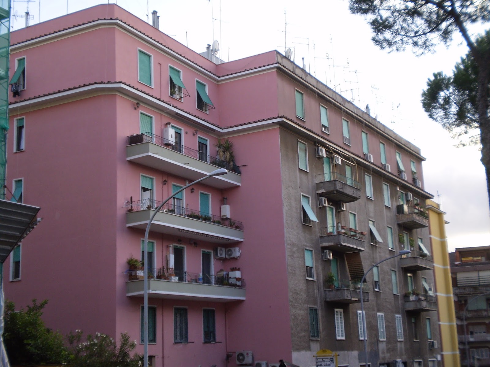 Proprio lì accanto, sempre su viale delle Gardenie, un altro enorme complesso a cui, però, non è toccata la stessa fortuna. La ristrutturazione ha riguardato solo un’ala dello stabile e i colori usati sono decisamente “forti”, con delle tonalità che starebbero bene, forse, ad Eurodisney. Lo stacco tra il rosa nuovo di pacca e il grigio vecchio di 50 anni non fa che acuire il senso di incompletezza e fastidio per questo intervento, in cui si sconta anche la pecca di aver mantenuto sul terrazzo una selva  disordinata di fili e antenne.