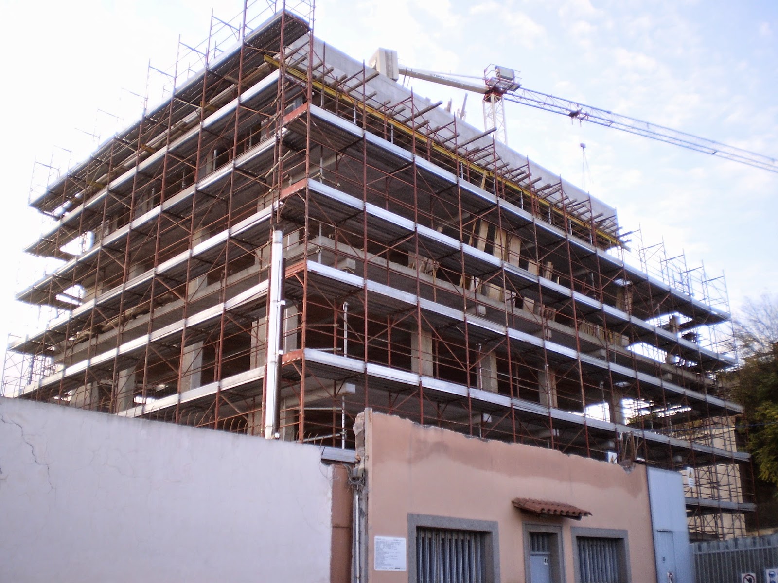 Da poco tempo si è alzato in fretta e furia lo scheletro di questo edificio. Purtroppo dalla strada non si riescono a ricavare ulteriori informazioni, anche in virtù del muro alto che copre parte del cantiere.
