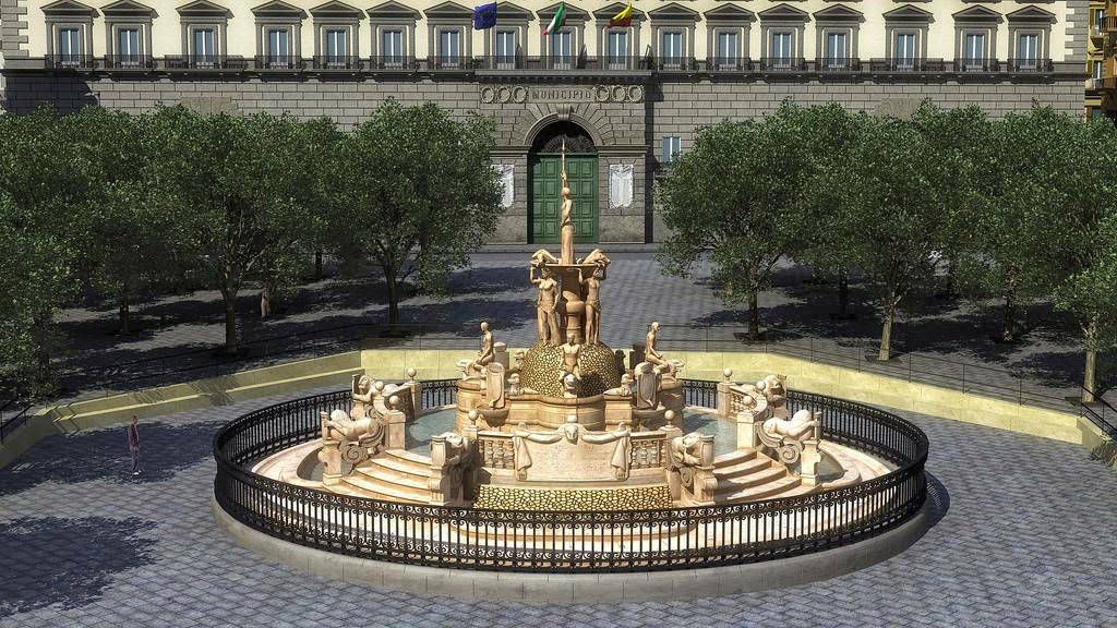 l’antica fontana spostata dalla vicina via Medina al centro della nuova piazza. In fase avanzata di montaggio |