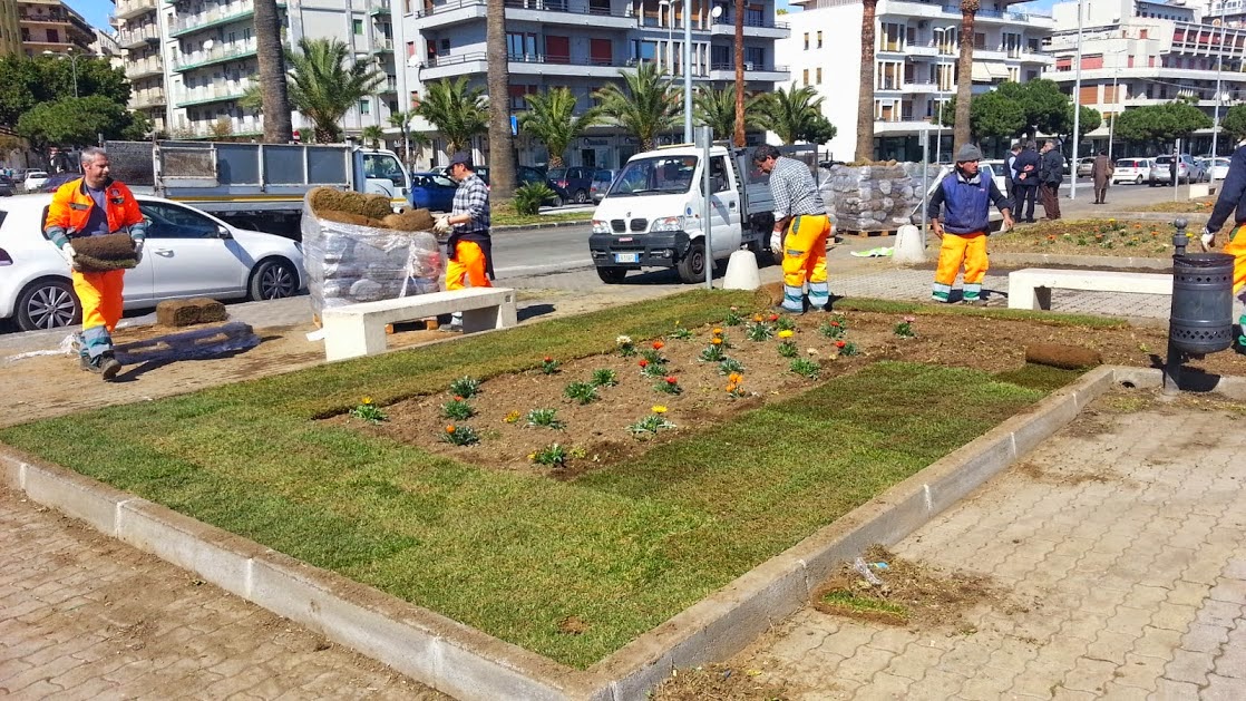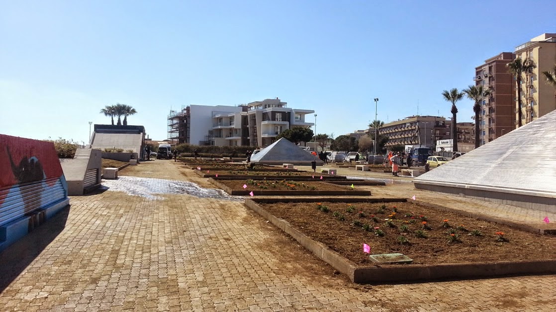 Per prima cosa, sono stati installati cinque nuovi pali dell’illuminazione: il precedente impianto, ad altezza d’uomo, era fuori uso da anni (vandalizzato) e pertanto, dopo ogni tramonto, il grande piazzale che si estende da piazza Galatea sin quasi a piazza Europa, sul lato est di viale Africa, piombava nel buio, con le facili conseguenze che si possono immaginare.