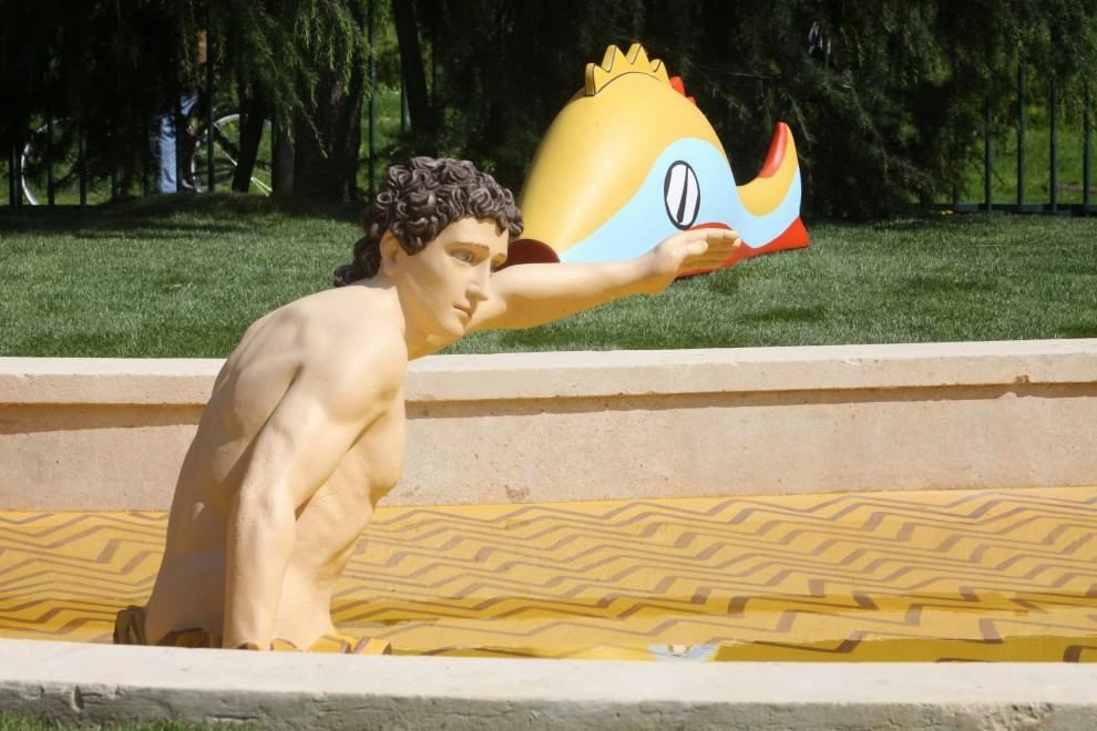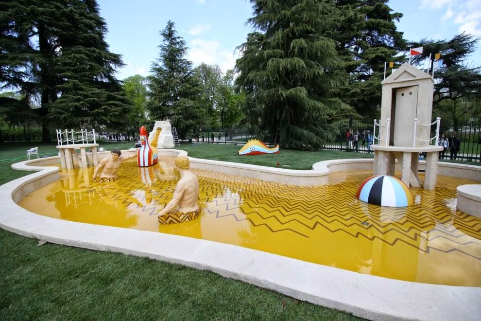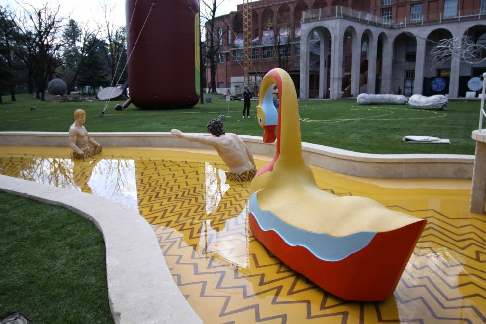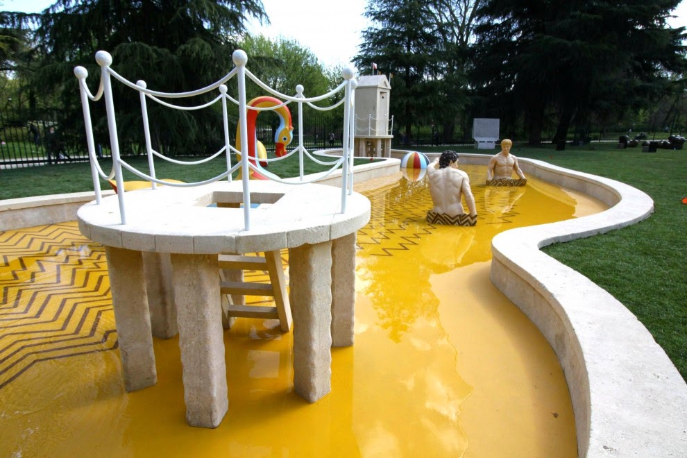 Si tratta di una vasca di forma sinuosa all’interno della quale emergono due nuotatori, un trampolino, una palla, una cabina, un cigno, un pesce e una fonte. L’opera era stata realizzata in occasione di una mostra ed aveva carattere temporaneo, infatti doveva essere smantellata alla fine dell’evento, ma come abbiamo visto, l’opera rimase al suo posto.