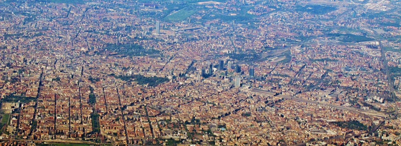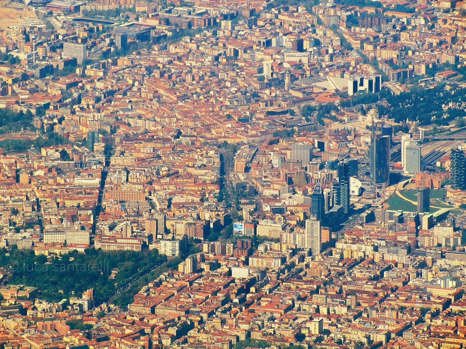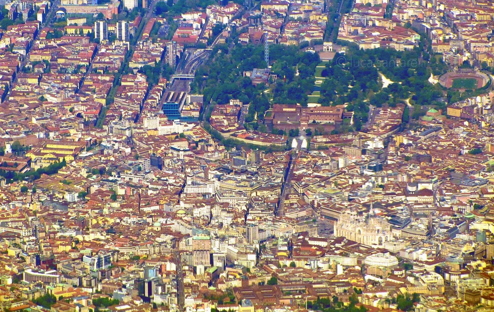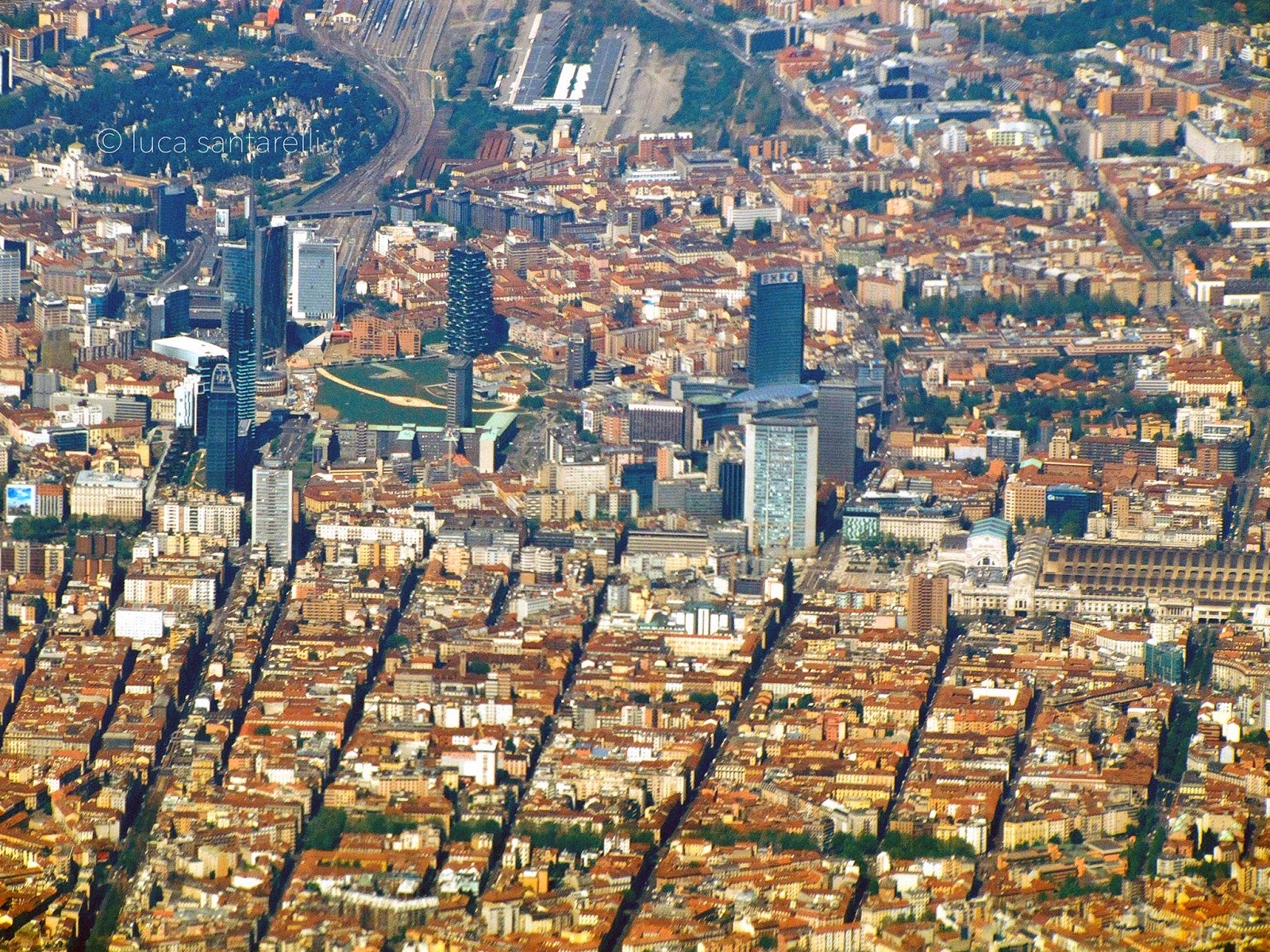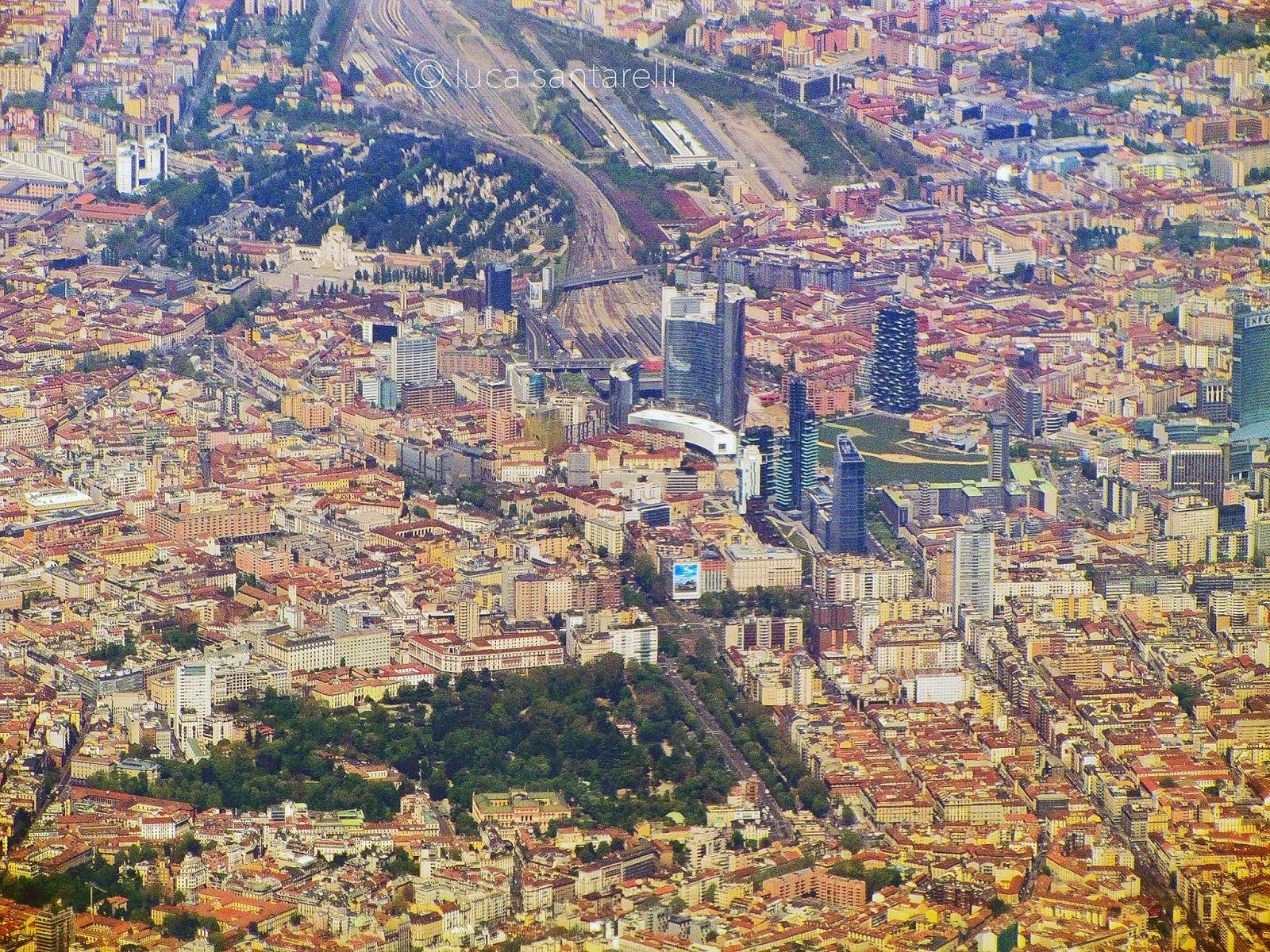 Una serie di fotografie scattate durante un sorvolo di linea su Milano da Luca Santarelli. Dalle foto si vede il Centro di Milano, la zona di Porta Nuova e della Stazione Centrale, il Castello e il Sempione.