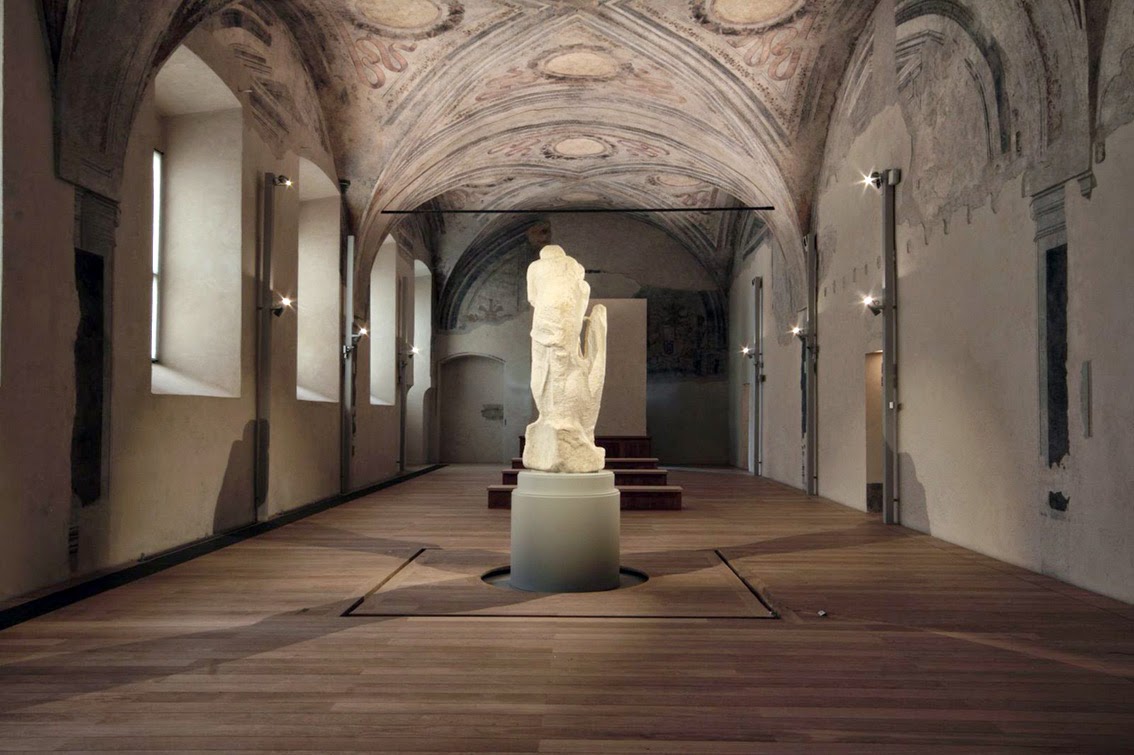 All’interno dell’antico Ospedale Spagnolo, con i suoi delicati affreschi, l’intensità struggente dell’opera incontra un’architettura ideale, che sembrava attenderla da tempo. In quegli spazi collegati alla sofferenza, realizzati per i soldati della guarnigione spagnola del Castello colpiti dalla peste nella seconda metà del ‘500, proprio pochi anni dopo il momento in cui Michelangelo a Roma lavorava alla Pietà Rondanini, la scoperta delle parole del credo apostolico, a quel tempo conforto di soldati malati, appare come una casualità particolarmente suggestiva.