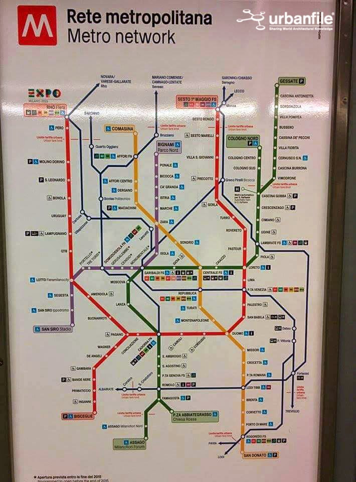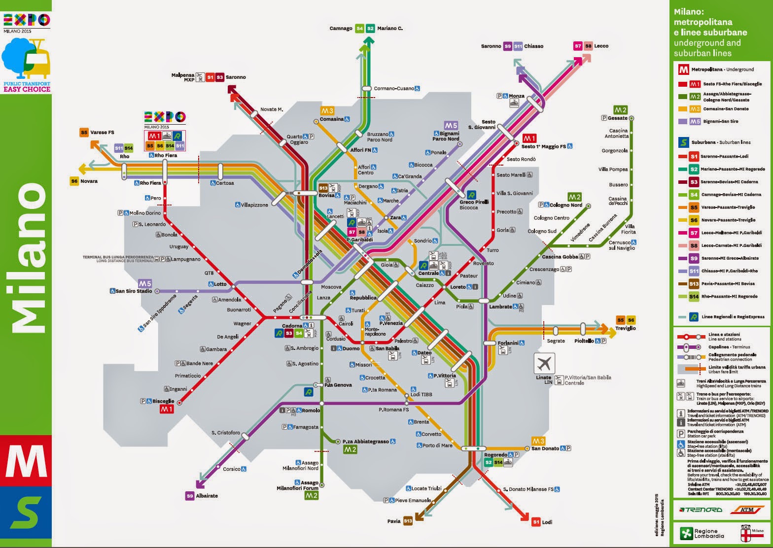 Lo schema stampato e affisso alle stazioni metropolitane e alle pensiline delle linee in superficie risulta quindi incompleto ed errato. Non possiamo eluderci dal non condividere con voi la “chicca” che ATM è riuscita a partorire, copiando in modo errato la mappa dei trasporti EXPO (metropolitana e linee suburbane), non riuscendo ad adattare lo sfondo grigio dei confini del comune di Milano alla dimensione della stessa mappa. Infine è stato riproposto lo schema verticale geograficamente errato – aggiornato per l’apertura di M5 e le linee suburbane S7 e S14 e il prolungamento di S11 – sui vagoni interni delle linee metropolitane M1, M2 e M3, ri-aggiungendo i tratti delle linee suburbane nei confini comunali, caratterizzati dal colore blu.