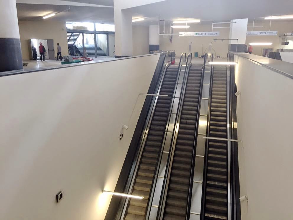 anche per le scali mobili la scelta cromatica è sempre la stessa. Idem per la banchina che non appare in questa galleria fotografica, ma visibile dal treno quando si passa in questa stazione. |