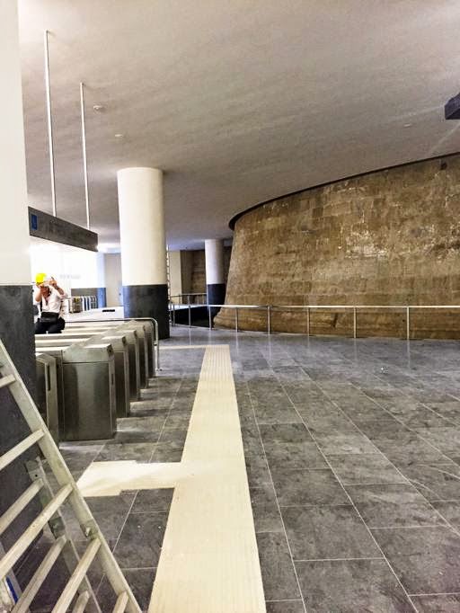 Altra cosa che subito richiama l’attenzione arrivati nel mezzanino, è il Torrione dell’Immacolata. Grazie alla metro è stato possibile riportare alla lucela base del torrione che una volta chiudeva la cinta muraria difensiva del Maschio Angioino. |