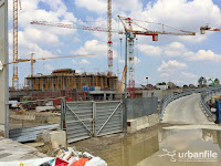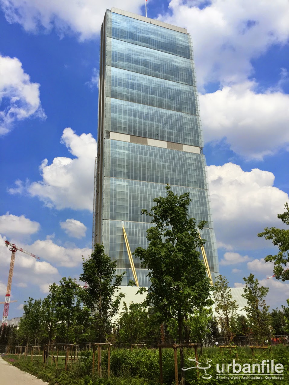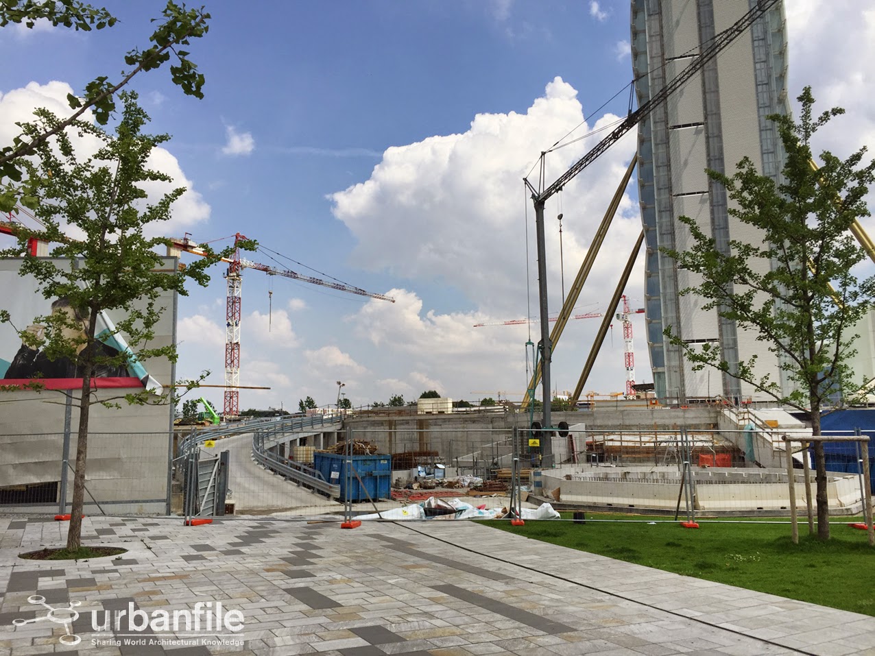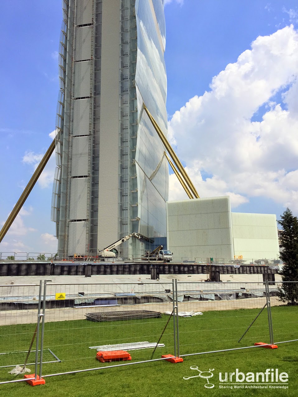 La torre Isozaki è quasi terminata e molto presto sarà anche abitata. Anche il cantiere alla base del grattacielo è in fase di completamento; si stanno infatti iniziando a smontare le cesate al lato della Torre. Questo smontaggio consente di vedere come stanno procedendo i lavori di costruzione delle due piazze, quella sopraelevata e quella inferiore che consente l’accesso alla metrò.