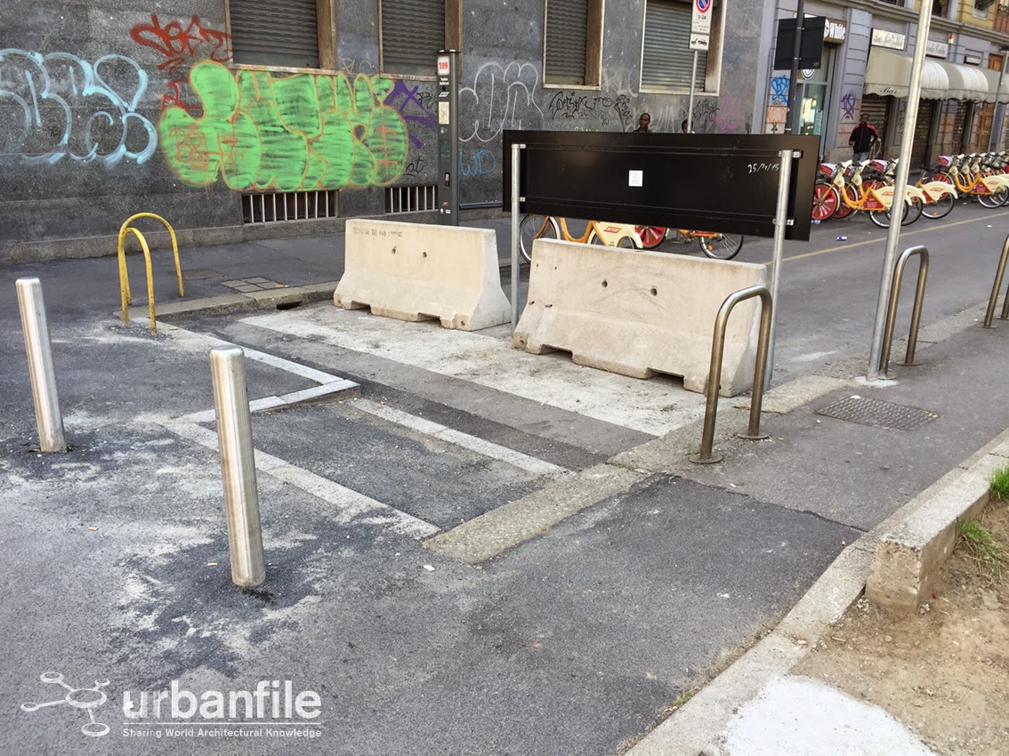Oltre a ciò le aiuole posteriori sono sporche e maltrattate. Come se non bastasse, chi desidera utilizzare le biciclette del servizio BikeMi deve compiere dei giri lunghissimi per andare in viale Tunisia che dista un solo metro, poiché sono stati posizionati dei blocchi di cemento che impediscono il transito da quel lato e dove si trova lo scivolo per accedere alla ciclabile da poco terminata, perché?