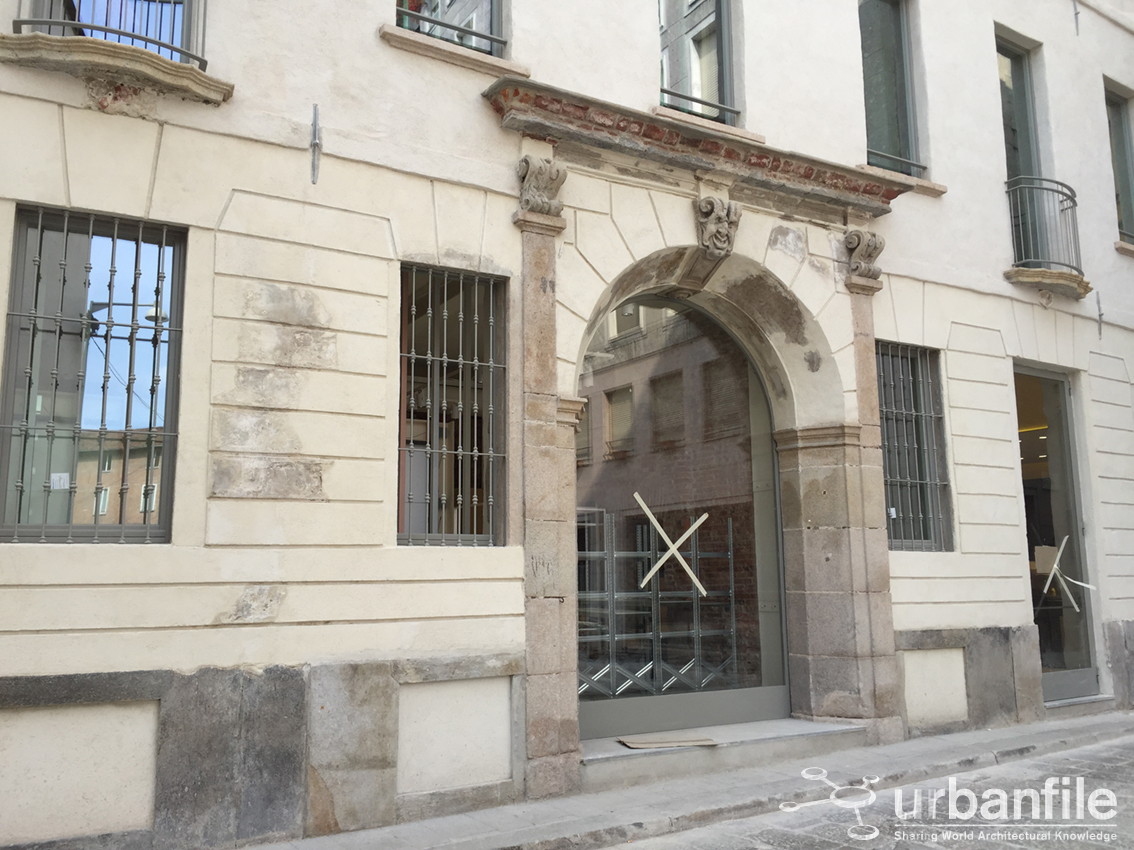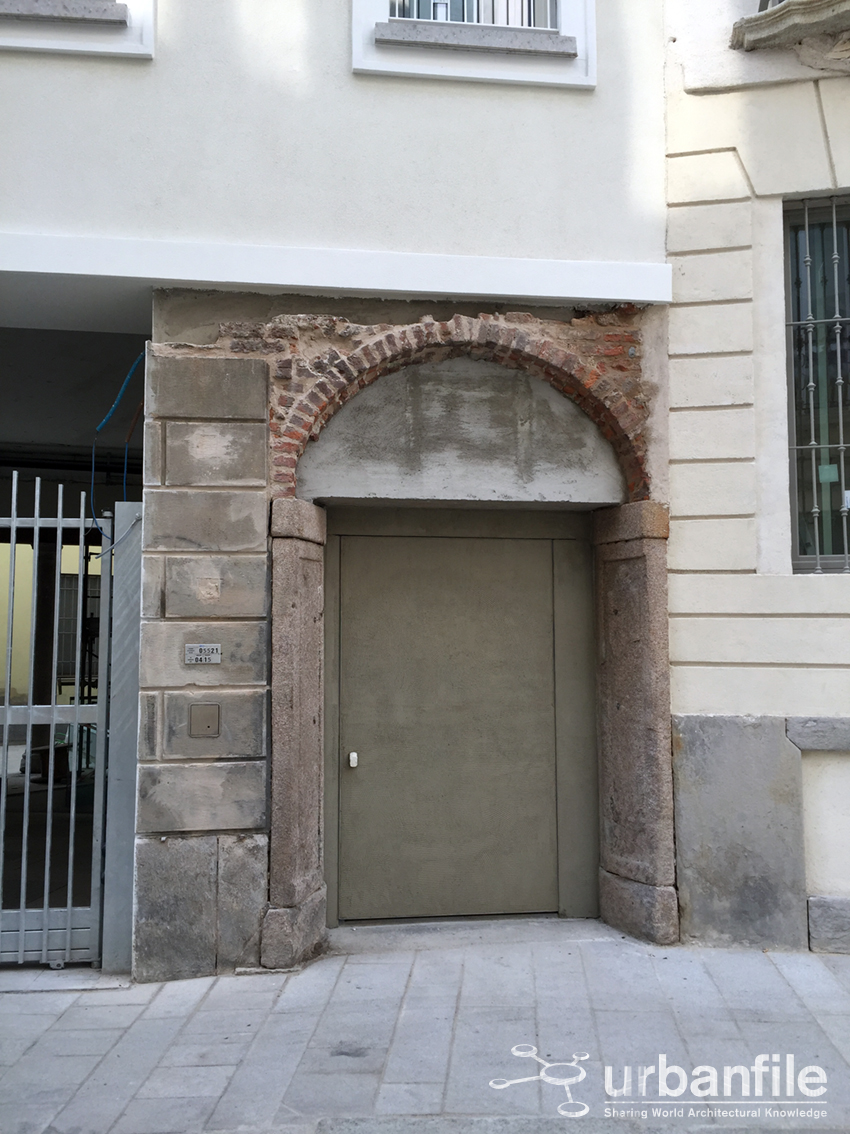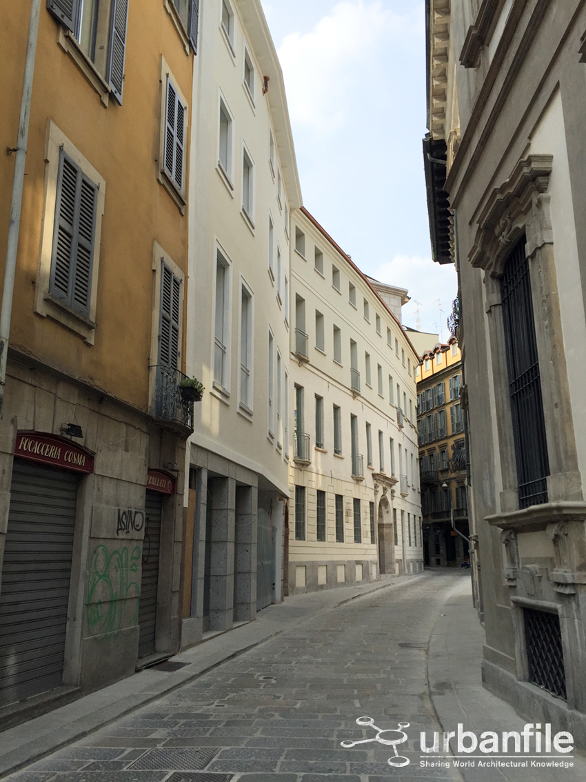 Il primo palazzo che vediamo arrivando da piazza Sant’Alessandro è stato completamente ricostruito in versione moderna; del vecchio edificio si era conservato ben poco: si vedono due colonnine – ora rimaste nel piccolo cortiletto – e il vecchio portoncino. Il palazzo con più avanzi – che si trovava in via Lupetta al numero 8 – è stato ricomposto in parte con delle aggiunte lasciate in evidenza nella parte superiore. Peccato che, nella nuova versione, le finestre non abbiano più le persiane e quindi l’aspetto dell’edificio ci appare un po’ incompleto.
