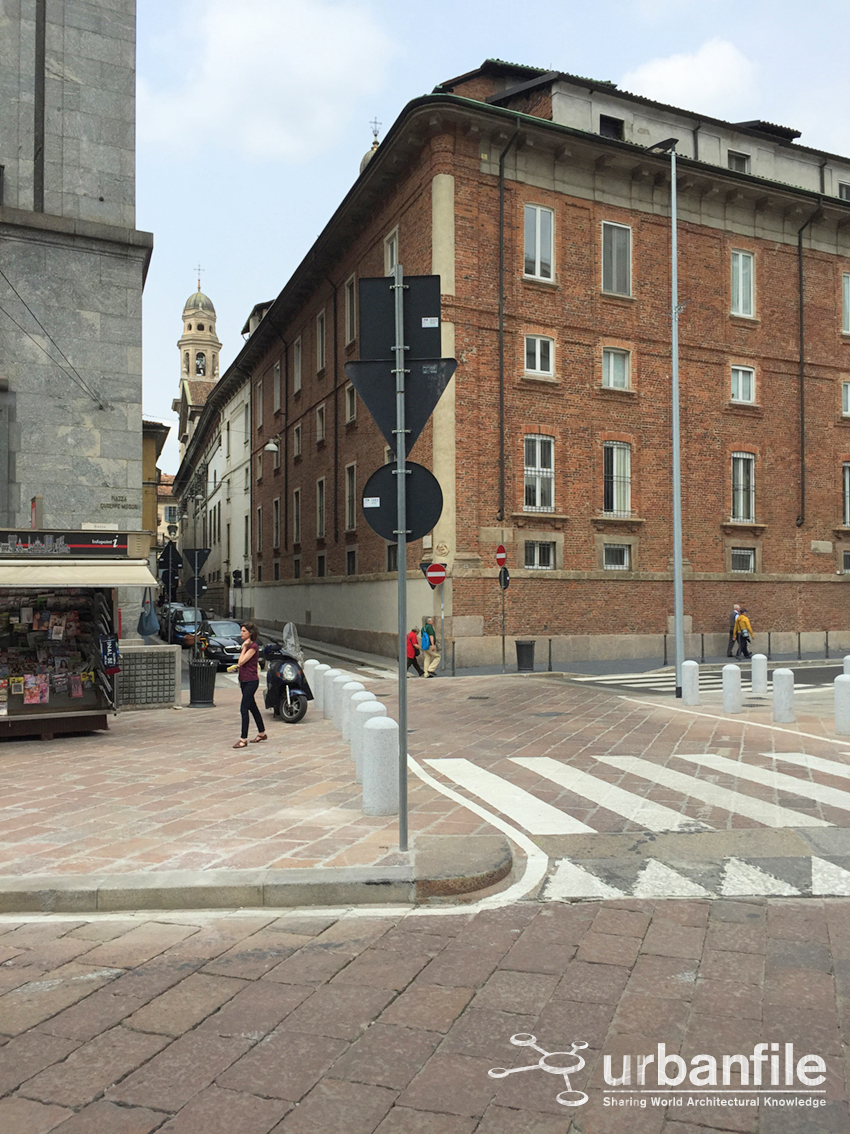 Non ci convince, innanzitutto, l’asfaltatura dei marciapiedi lungo Via Unione e il tratto in corrispondenza del civico 2. Perché non utilizzare la pietra per omologare così tutta la piazza? Da progetto, i “segni” che avrebbero tracciato la posizione originaria della facciata della chiesa di San Giovanni erano chiari ed evidenti, mentre nella pratica, con l’utilizzo delle pietre di riciclo, l’effetto è meno incisivo.