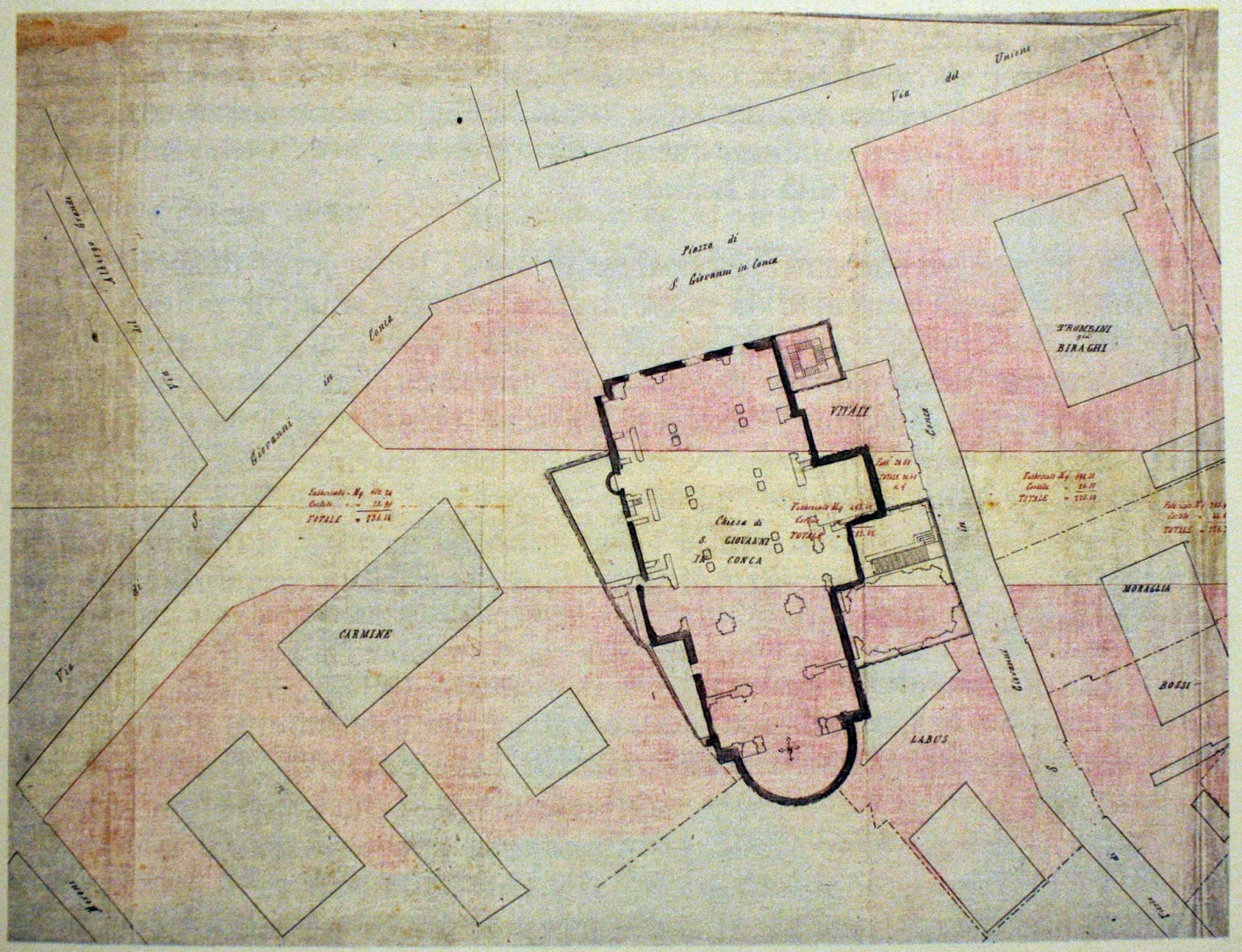 Qui un tempo c’era il sagrato della chiesa di San Giovanni in Conca, luogo antichissimo e prezioso che, per ragioni di mobilità e di progetti per una cosiddetta “città moderna”, è stato sacrificato diverse volte: una prima parte nel 1879, quando si aprì Via Carlo Alberto (ora Via Mazzini) e, infine, una seconda sul finire degli anni Quaranta, quando la chiesa sparì completamente.