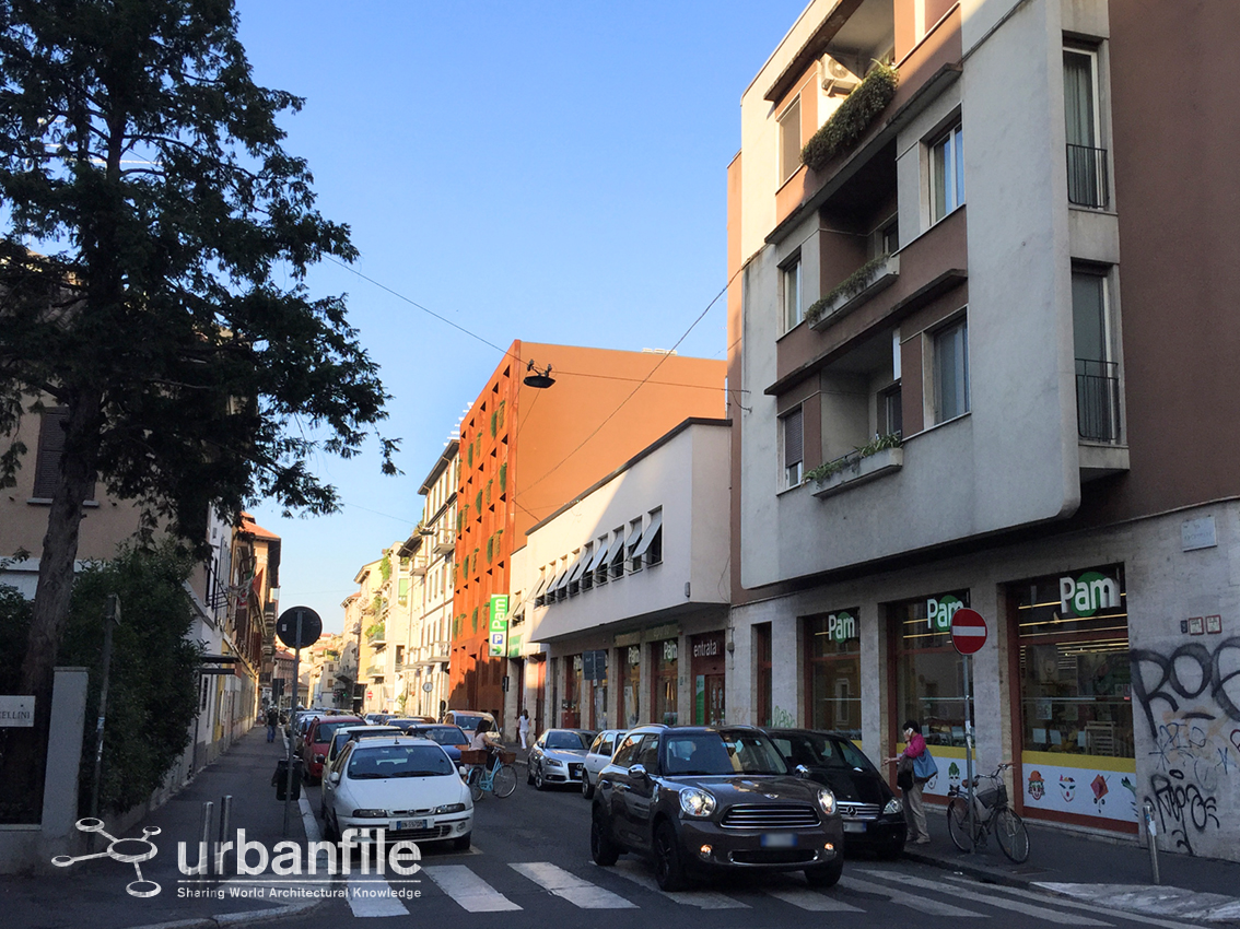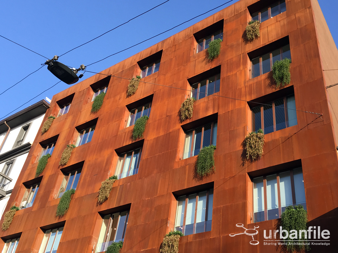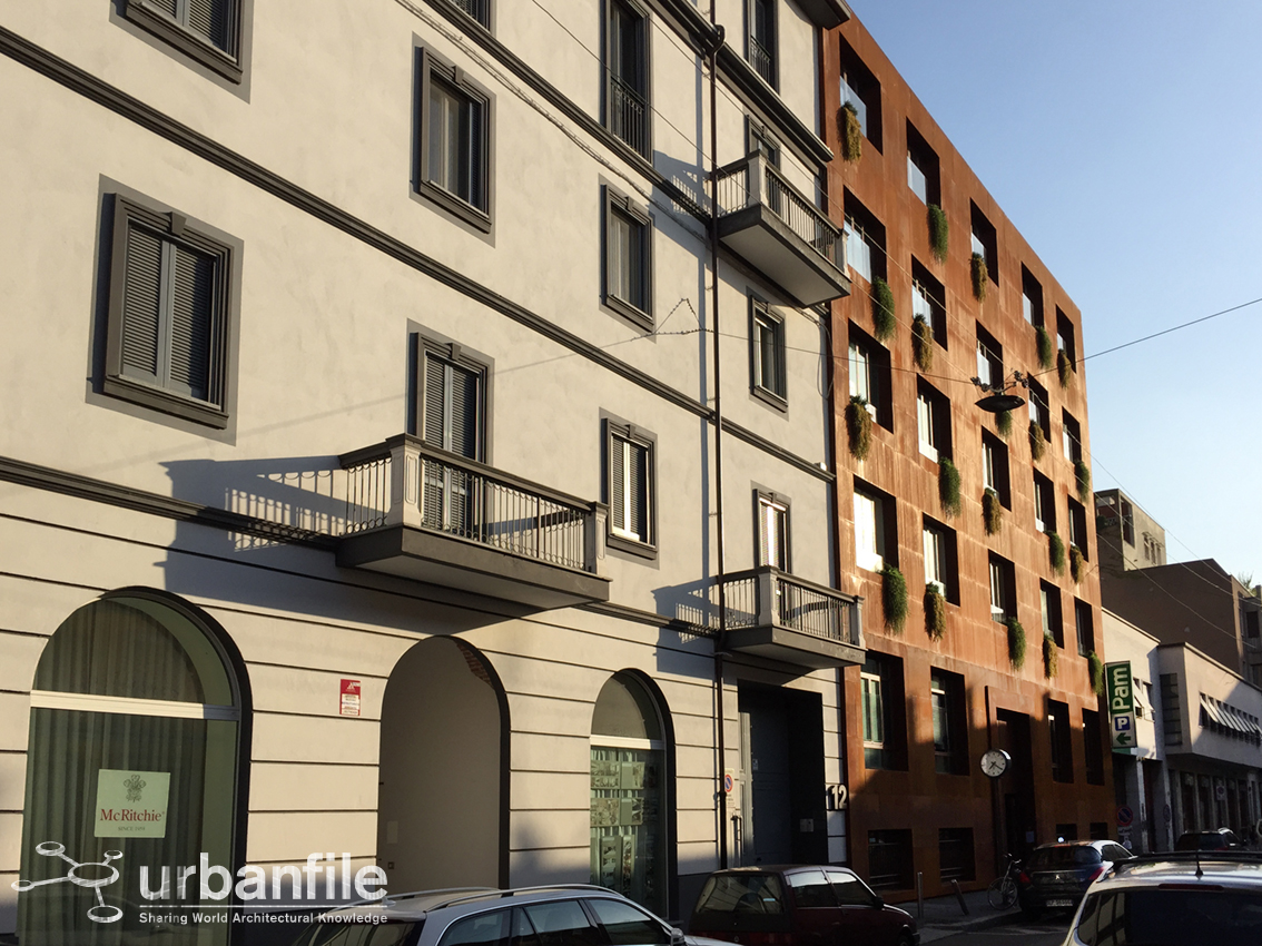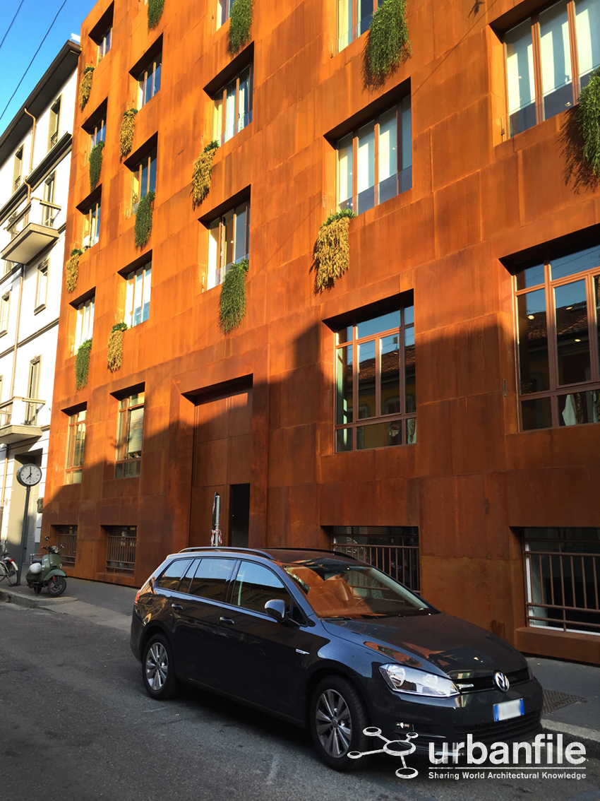 Al civico 10 di via Archimede un palazzo per uffici, recentemente ha cambiato pelle. Infatti dal vecchio rivestimento di piastrelline in voga negli anni Sessanta è stato rivestito col più caldo e moderno cor-ten, materiale metallico che appare già ossidato e quindi diventa elemento decorativo col suo colore ruggine così caratteristico. Il corten di questi tempi è molto in voga, solitamente viene utilizzato per piccole porzioni come elemento decorativo, ma in questo caso riveste l’intero edifici che è stato anche aumentato di un piano.