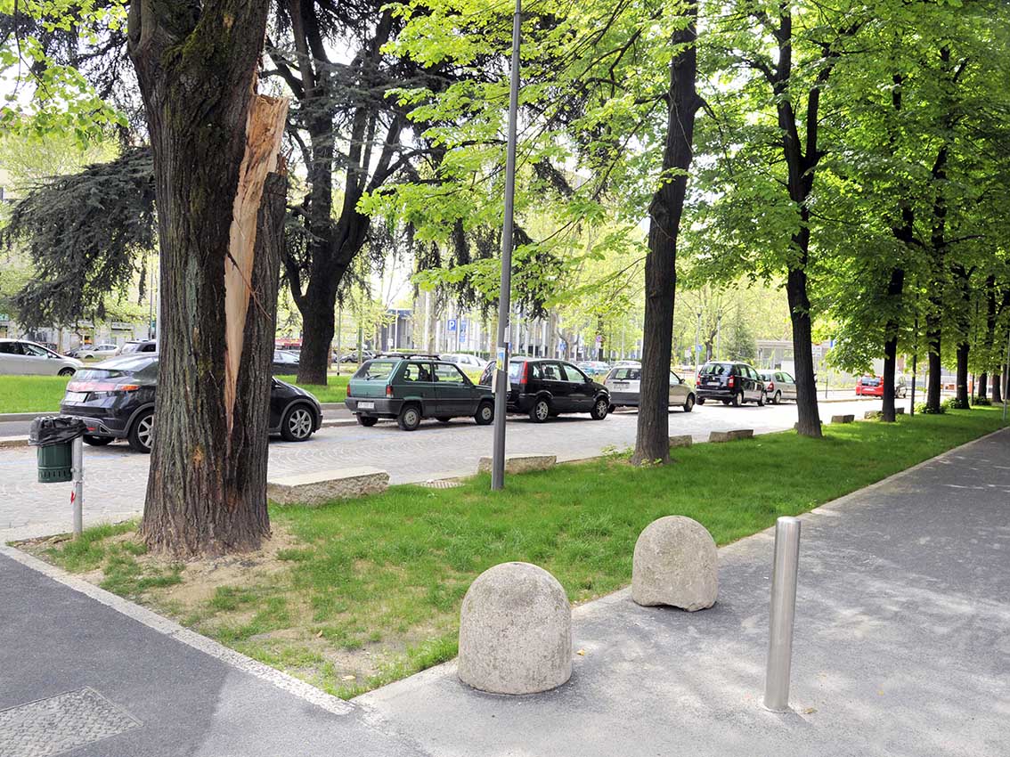 Comunque si tratta di una sistemazione che a noi ci lascia un po’ perplessi, come i doppi lampioni affiancati posti agli angoli o l’eccessiva palificazione, a volte inutile. Così come i dissuasori a panettone, che sanno di temporaneo, oppure quelli in pietra di recupero che renderanno impossibile il parcheggio sotto gli alberi e che sembrano un po’ strani.