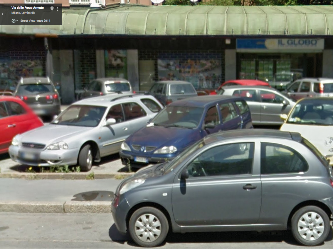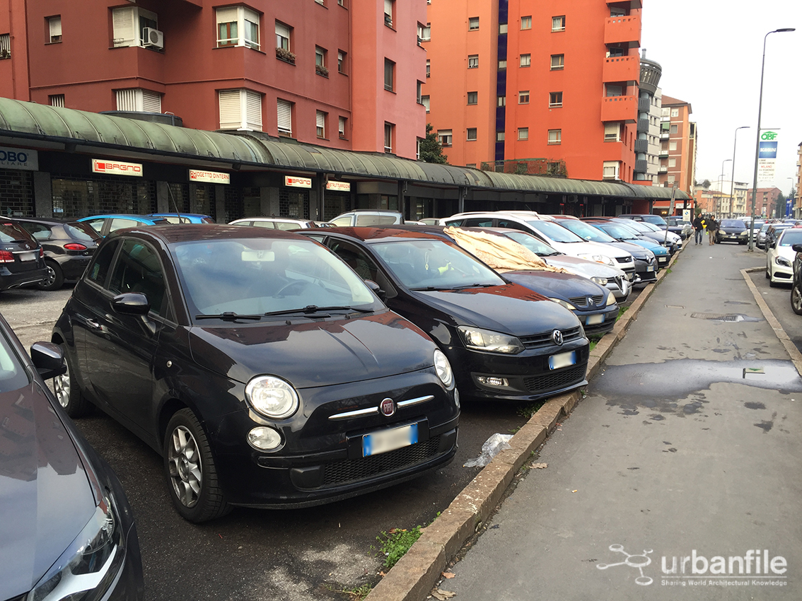 In Via delle Forze Armate 260 si trova il condominio dei Giardini la Viridiana realizzato dagli architetti Luigi Caccia Dominioni e Vico Magistretti nel 1968-1972 per una clientela medio borghese (forse il colore rosso mattone che li distingue era sinonimo di edifici di pregio, visto che abbiamo lo stesso esempio per Milano 2 e 3). Giardini, piscina, servizi e vigilanza, per un quartiere volutamente pensato per l’alta qualità. A due passi da Baggio che andava sempre più assumendo un aspetto popolare, la Viridiana doveva portare qualità alla zona. A distanza di oltre quarant’anni possiamo dire che gli edifici reggano ancora il confronto, ma c’è una cosa che abbiamo trovato allucinante e che ci pare assurdo nessuno provveda a risolvere: ci riferiamo all’aspetto che il supercondominio assume dalla via delle Forze Armate. A due passi da dove si accede al complesso, ingresso super sorvegliato giorno e notte da una portineria circolare, si trova un grande marciapiede con una “galleria” commerciale porticata e aperta sulla strada. Qui qualche vetrina è vuota oramai e il marciapiede è mal tenuto ed è utilizzato come un banale parcheggio. Facciamo notare addirittura che abbiamo visto un’auto usata da qualcuno come dimora (delle coperte oscuravano i vetri) e andando su Google Street View abbiamo notato la presenza di questa vettura parcheggiata nello steso punto dal 2012. Un cartello (malconcio) avvisa che il parcheggio è privato e che è vietato parcheggiare auto estranee al comprensorio.