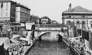 Via Melchiorre Gioia, il Naviglio Martesana con bagnanti e a destra le Cucine Economiche realizzate nel 1883