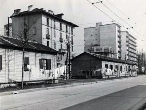 Cagnola – Viale Renato Serra poco prima dell’incrocio con viale Certosa con le casette degli sfollati, 1945-46