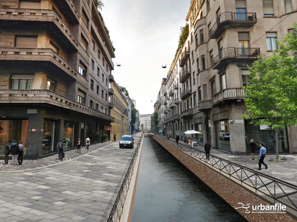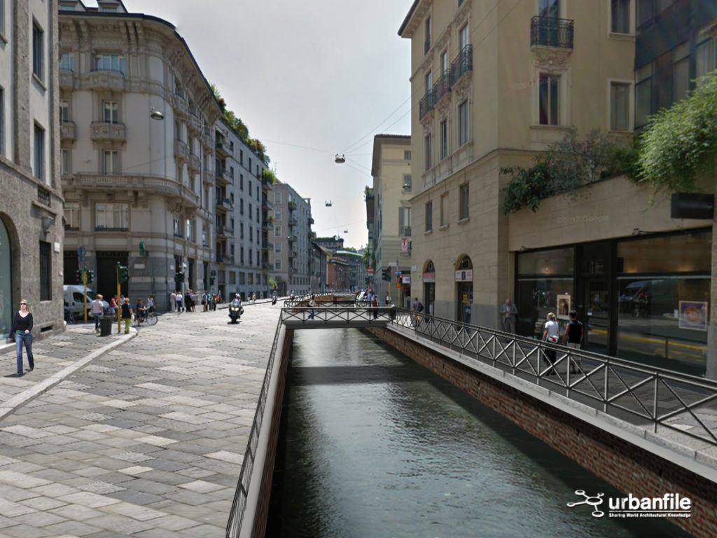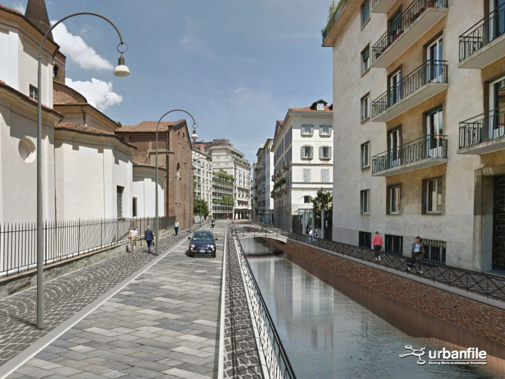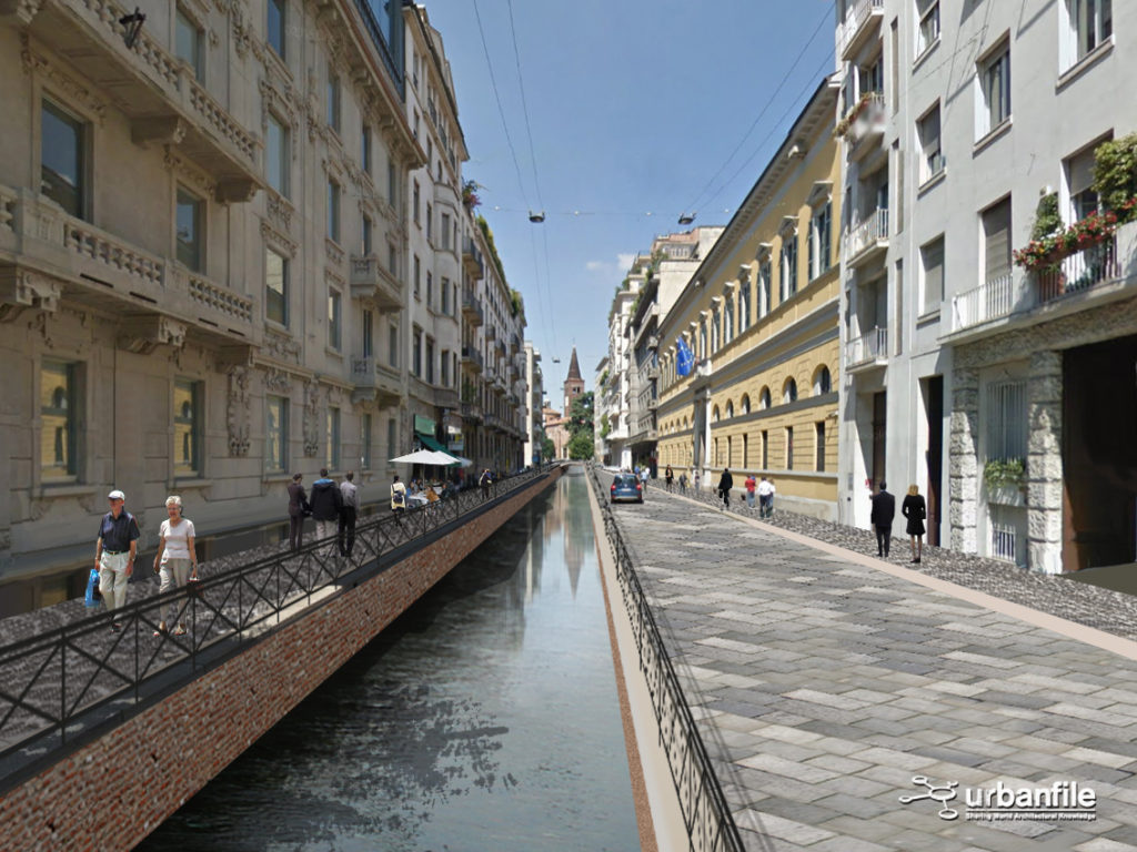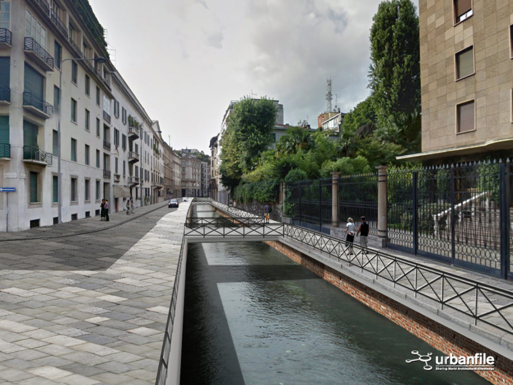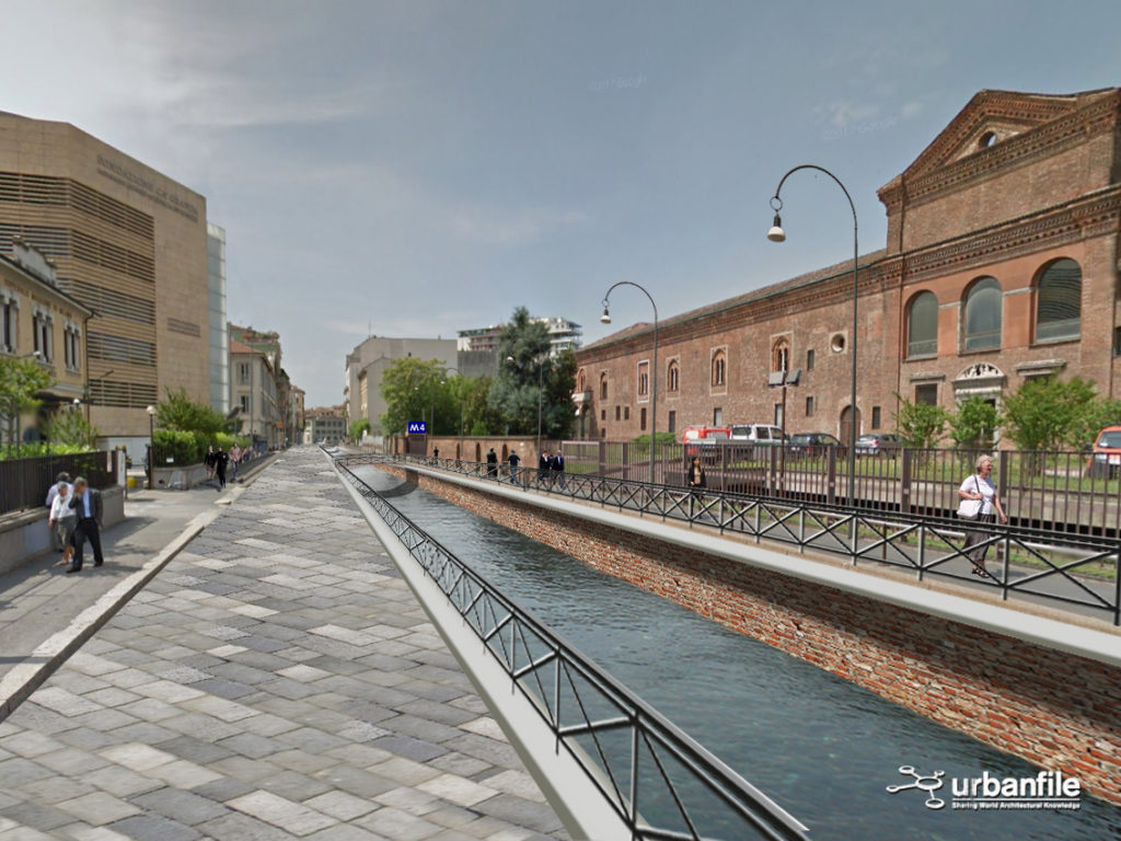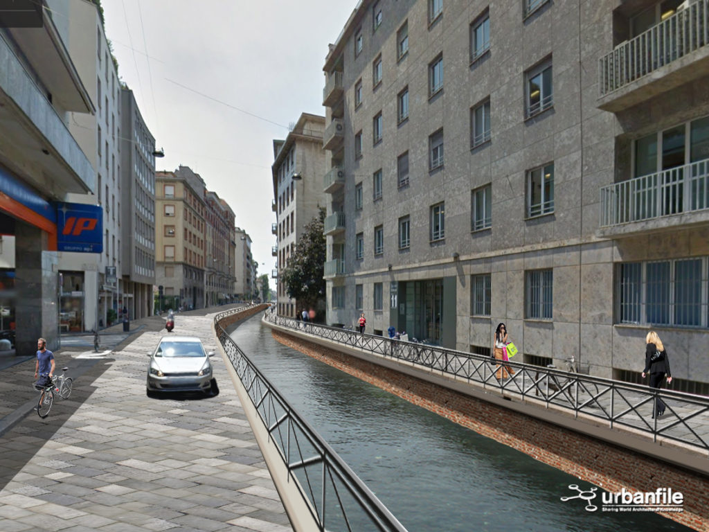 Noi abbiamo cercato di verificare visivamente, con una serie di fotomontaggi, quale impatto avrebbe la riapertura della Cerchia dei Navigli nella città attuale. Naturalmente il progetto non sarà più una ricostruzione com’era e dov’era (anche per impedimenti di carattere tecnico) ma sarà un adattamento moderno del canale con le attuali necessità.
