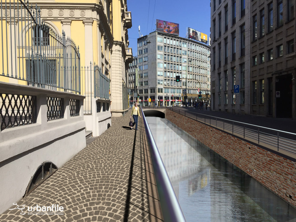 Il basolato grigio lo metterei lontano dal canaletto è dallacqua mentre utilizzerei più il pavè in tonalità rossiccio (che è presente in molte zone belle di Milano). Perloemno a contorno pedonale del canale, creando una striscia parallela ideale di rispetto per i pedoni.