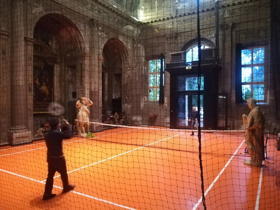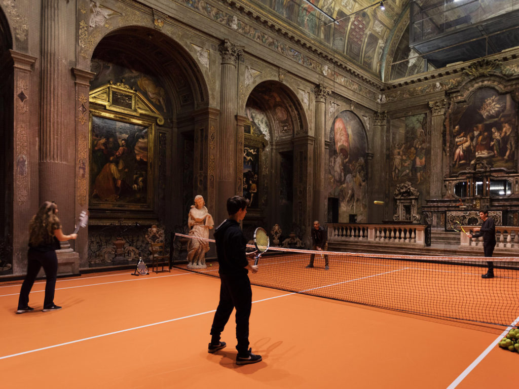 Recentemente l’artista Asad Raza (Stati Uniti, 1974), ha allestito all’interno della navata unica, un mini campo da tennis. L'”opera”, come quasi tutte le istallazioni ha lo scopo di provocare, ma era proprio necessaria quest’operazione?
