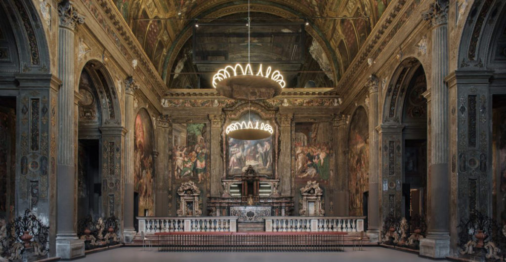 l’opera – che voi mettete tra virgolette, esprimendo così il vostro giudizio – può piacere o non piacere, ma non intacca la struttura in alcun modo, reinterpretando il luogo e avvicinandolo a persone che altrimenti non avrebbero mai messo piedi nella chiesa.