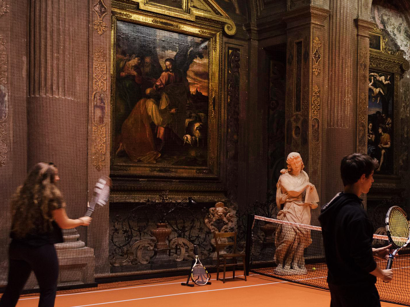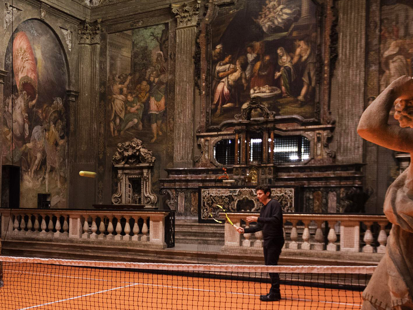 Recentemente l’artista Asad Raza (Stati Uniti, 1974), ha allestito all’interno della navata unica, un mini campo da tennis. L'”opera”, come quasi tutte le istallazioni ha lo scopo di provocare, ma era proprio necessaria quest’operazione?
