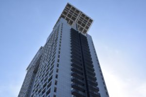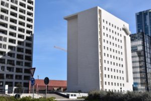 Ma la parte più assurda del nuovo polo direzionale risiede tuttavia nell’unica zona riservata al residenziale, con la torre Purini che cozza con tutto il resto da qualsiasi prospettiva la si guardi, sia per via della staticità dettata dalle banalissime forme, sia per le spropositate orecchie presenti in cima, ma anche per i divisori posizionati nelle loggette dell’edificio, degli assi sporgenti messi a caso che rovinano l’unico punto di pregio della torre, la simmetria.