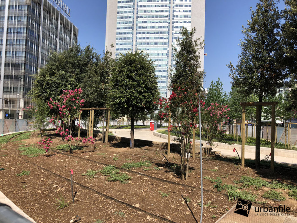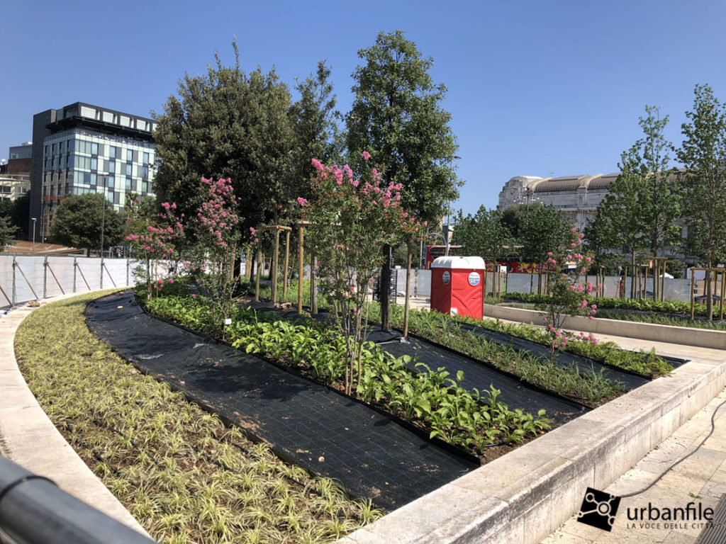 L’aiuola a mezza-luna che si trova davanti all’ingresso di via Vittor Pisani è in riqualificazione dal marzo scorso: molte più piante, molti fiori e cespugli fioriti.