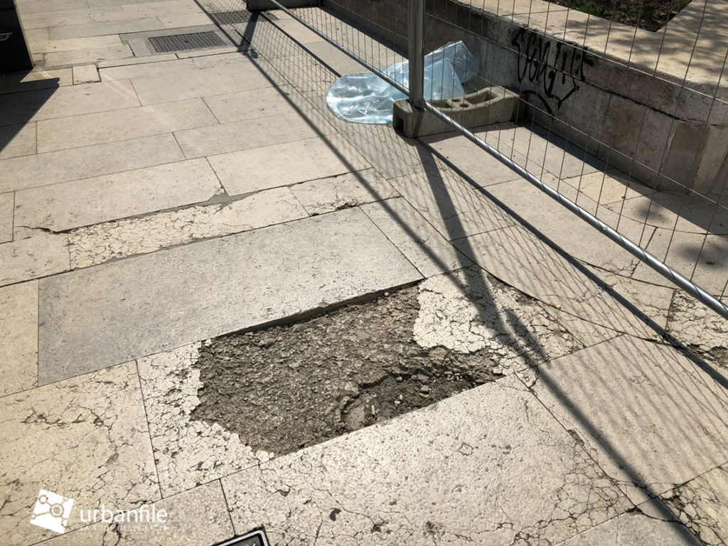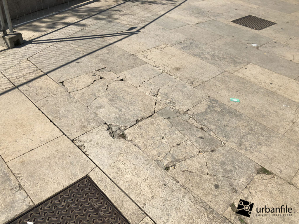 Altra nota che vogliamo sottolineare, e di cui avevamo già parlato in precedenti articoli: la pavimentazione in pietra è molto danneggiata. Ci sono infatti interi blocchi in frantumi o addirittura sbriciolati che rendono difficoltoso il percorso nella piazza e di sicuro, nell’attuale intervento, non è inserito il loro ripristino. Chissà quando verrà programmata la loro sostituzione.