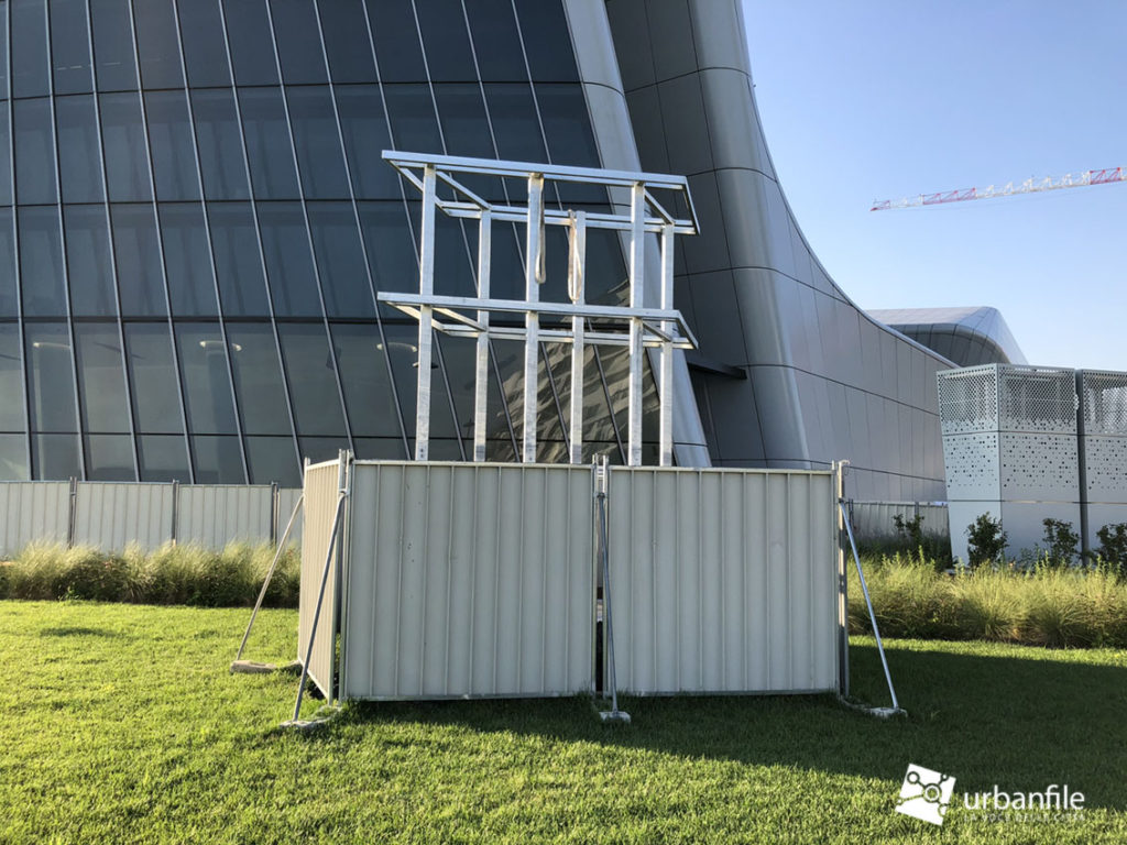 Sotto un centro commerciale, con negozi e ristoranti e sopra un giardino e terrazze, naturalmente ci sono tubazioni, scale di emergenza e bocchettoni per l’areazione che devono affiorare nella parte superiore. Come si vede dalle foto, ai piedi delal torre Hamid-Generali stanno comparendo delle strane strutture metalliche che fungeranno da mascherature per tubature tecniche dei sottostanti locali interrati.