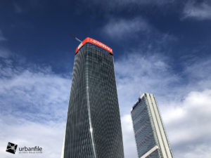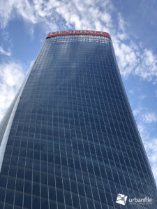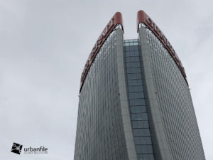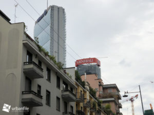 Ci è parso strano che sin dall’inizio della progettazione dell’intera torre non sia stato considerato uno spazio apposito per l’insegna. Oramai è consuetudine per le grandi società che occupano queste torri avere il proprio logo a simboleggiare il possesso dello stabile, perciò chiunque poteva immaginare che prima o poi sarebbe comparsa la scritta (un po’ come è successo al Diamantone alle Varesine, con l’insegna prepotente del gruppo BNP).