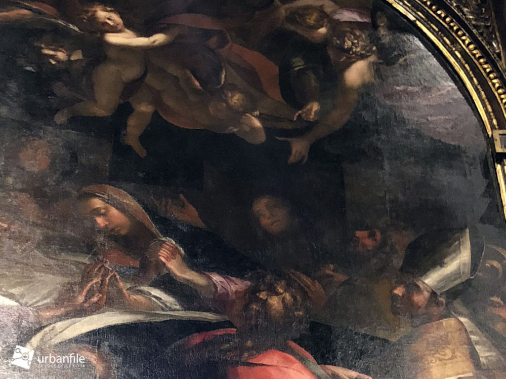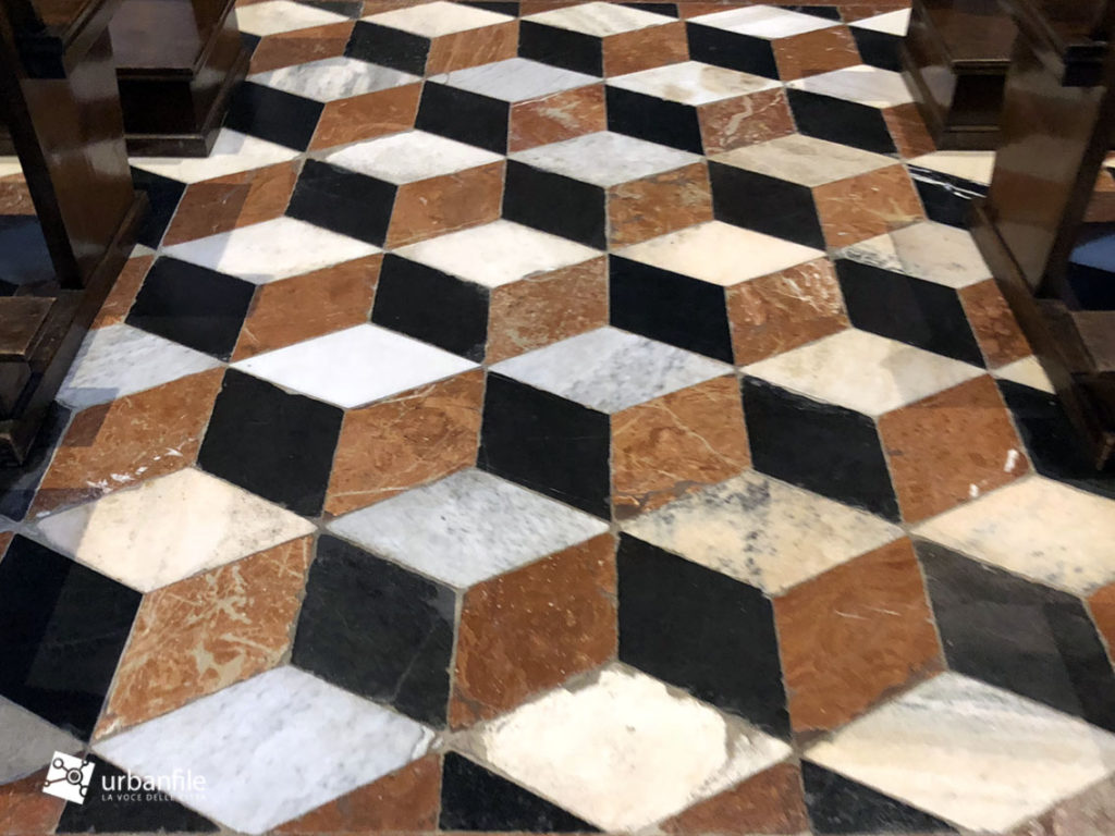 Va menzionato anche l’effetto concentrico del bellissimo pavimento “de marmi mandolati di bianco e di nero”, cui si aggiunge il tocco di rosso del “broccatello d’Arzo bello e di macchia”.