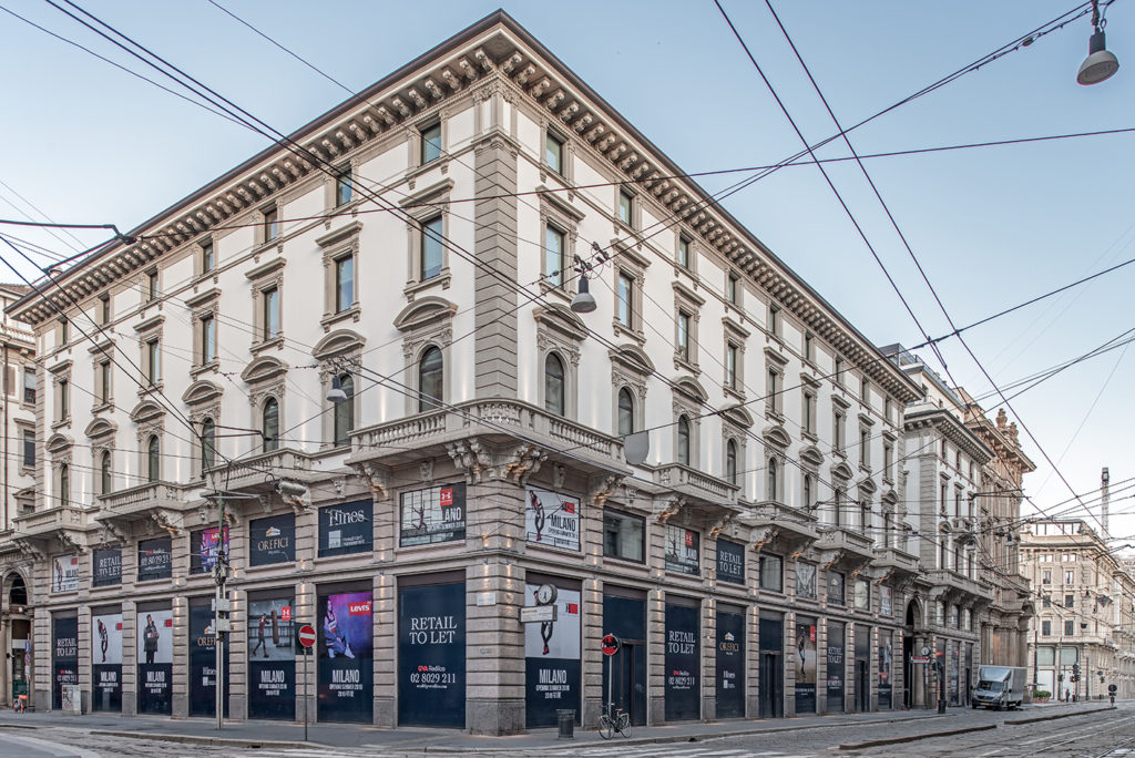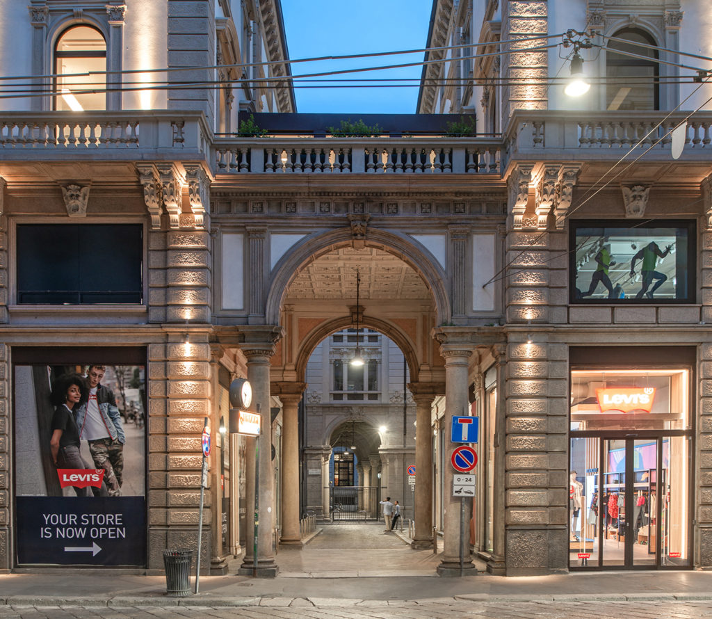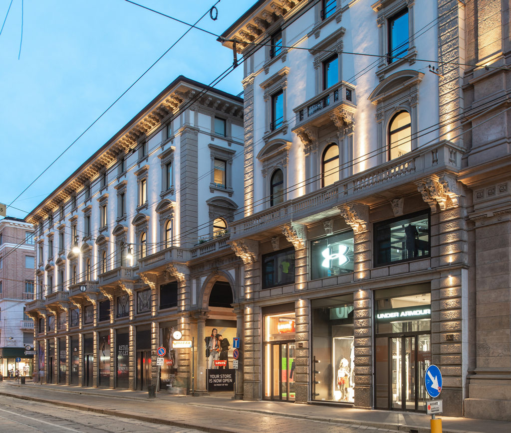 In generale, la percezione dell’edificio dalla strada viene alleggerita: le vetrine commerciali vengono tutte riaperte a tutta altezza con infissi molto sottili, riproposti anche al piano superiore con grandi specchiature. Il nuovo progetto di illuminazione esterna a led intende valorizzare i caratteri storici dell’edificio di pregio esistente, marcando però la contemporaneità dell’intervento di riqualificazione, e aggiungendo così un ulteriore tassello e una nuova “luce” al rinnovato district commerciale di piazza Cordusio.