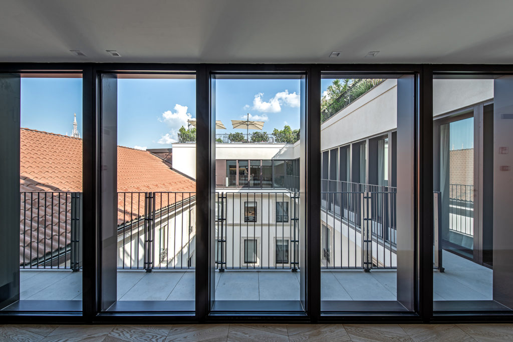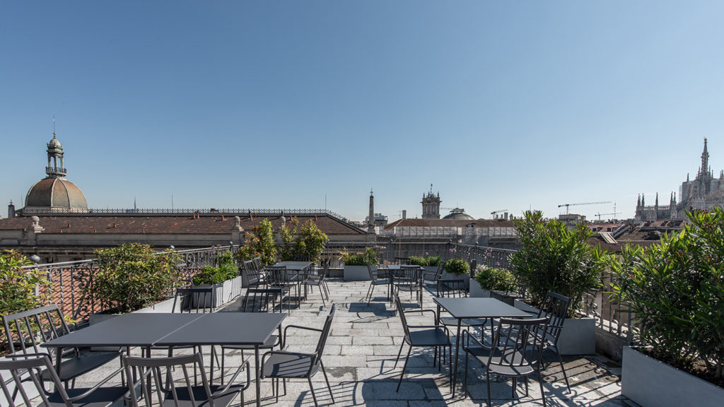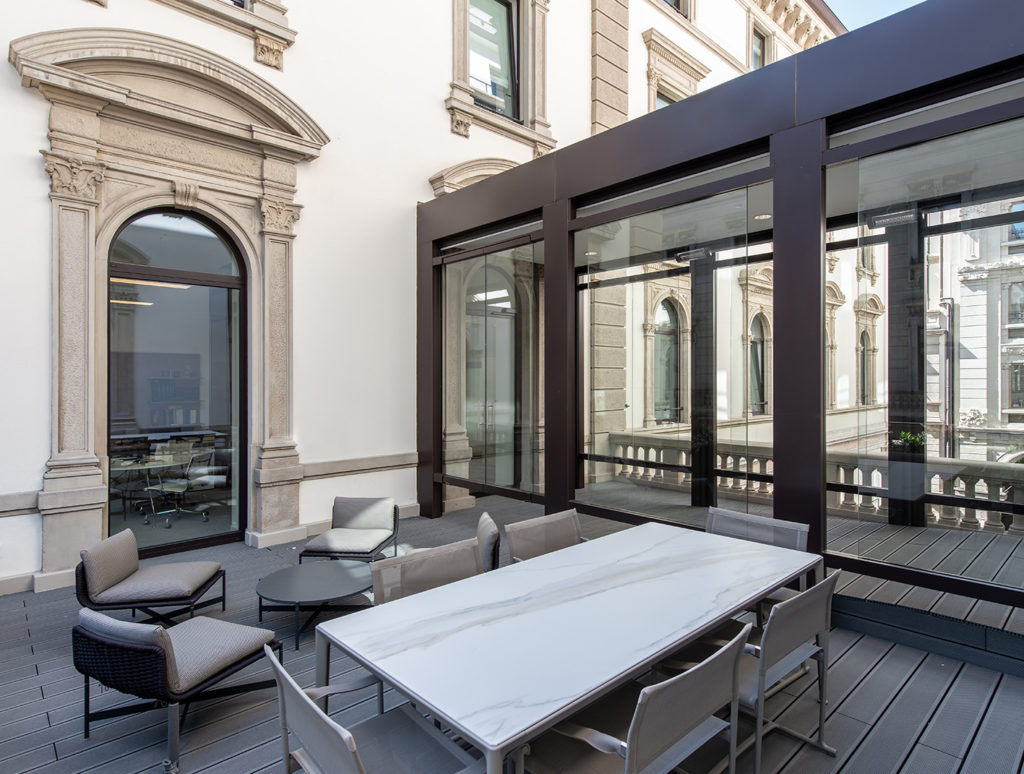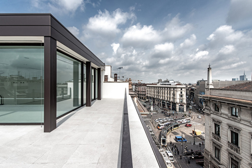 La riqualificazione e valorizzazione del quinto piano ha portato all’apertura di una nuova balconata vetrata che affaccia sulla corte, ritagliata nella falda del tetto e aperta verso il cielo. Anche il passaggio coperto tra i due edifici al secondo piano è un innesto leggero con una struttura in metallo verniciato e parziali tamponamenti in vetro multistrato, che trasforma spazi di transito in piccole “piazze” fruibili dagli affittuari degli uffici. Il recupero di spazi inutilizzati ha permesso di ricavare nuova superficie utile, e di dotare il complesso di una nuova e ampia terrazza in sommità all’edificio minore con un piccolo volume, sempre in metallo verniciato e vetro, da utilizzare come sala riunione dirigenziale e spazio di lavoro informale con vista sul centro della città e il Duomo. La riqualificazione dei collegamenti verticali ha portato da un lato a valorizzare la ricchezza delle scale nobili nel rispetto dei materiali esistenti, e dall’altro a dover gestire architettonicamente la presenza di nuovi volumi tecnici in copertura con rivestimenti, dove il prolungamento dell’ascensore esistente conduce ad una nuova “piazza alta”, una terrazza per eventi.