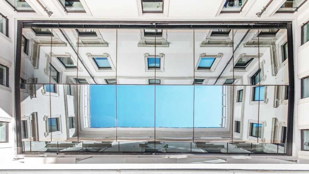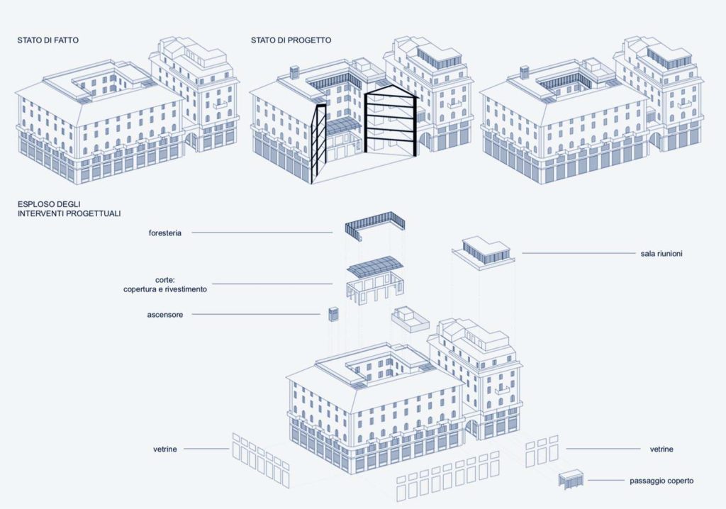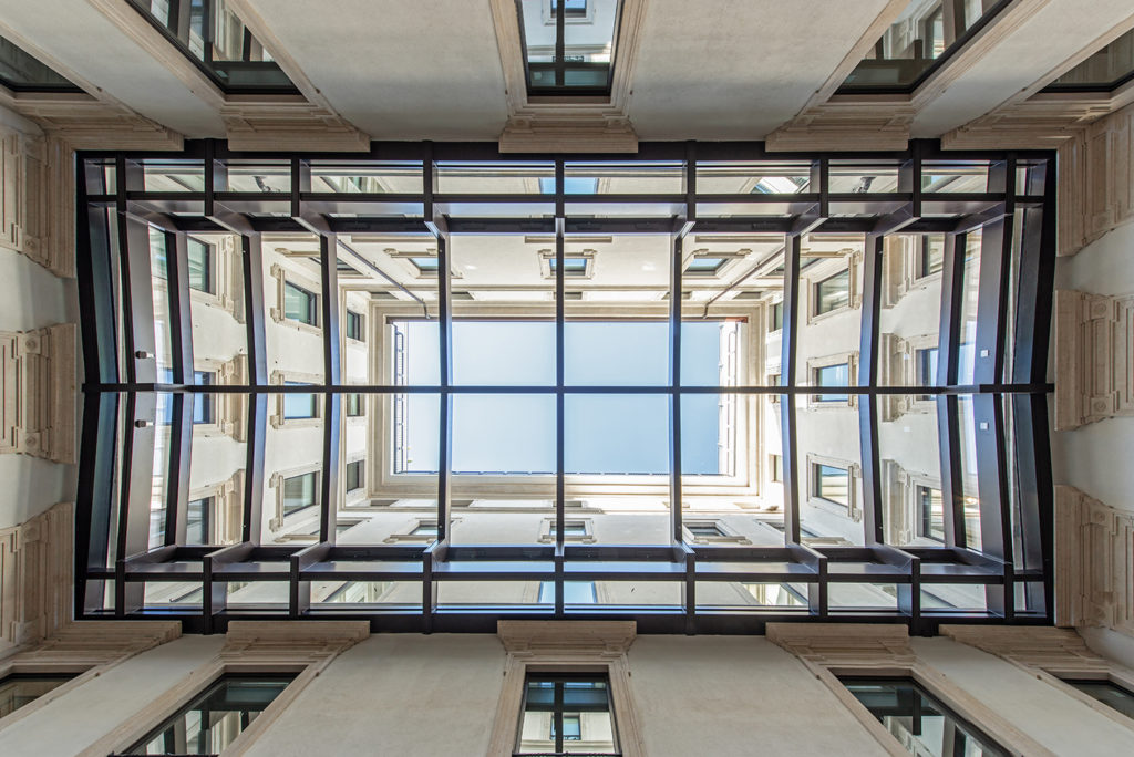 Abbiamo voluto mantenere la centralità della corte, rendendola occasione per un innesto contemporaneo “double-face”, creando un ambiente a doppia altezza con una copertura in acciaio e vetro volumetricamente complessa: la nuova copertura è trasparente e lascia passare la luce al piano terra commerciale, ma è specchiata verso i piani superiori destinati a uffici, in modo da moltiplicare e riflettere le facciate storiche che vi affacciano. Il rivestimento del piano terra in pannelli metallici dorati crea uno scrigno inatteso, che è solo possibile intravedere dell’esterno. Gli allineamenti degli elementi strutturali sono stati ripresi dal passo delle aperture, già coordinati nell’esistente con il disegno della pavimentazione della corte; i terminali impiantistici sono integrati in un disegno sobrio e minimale.
