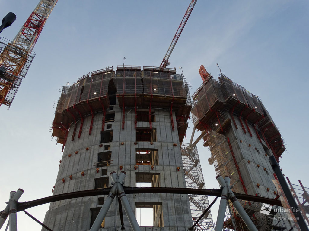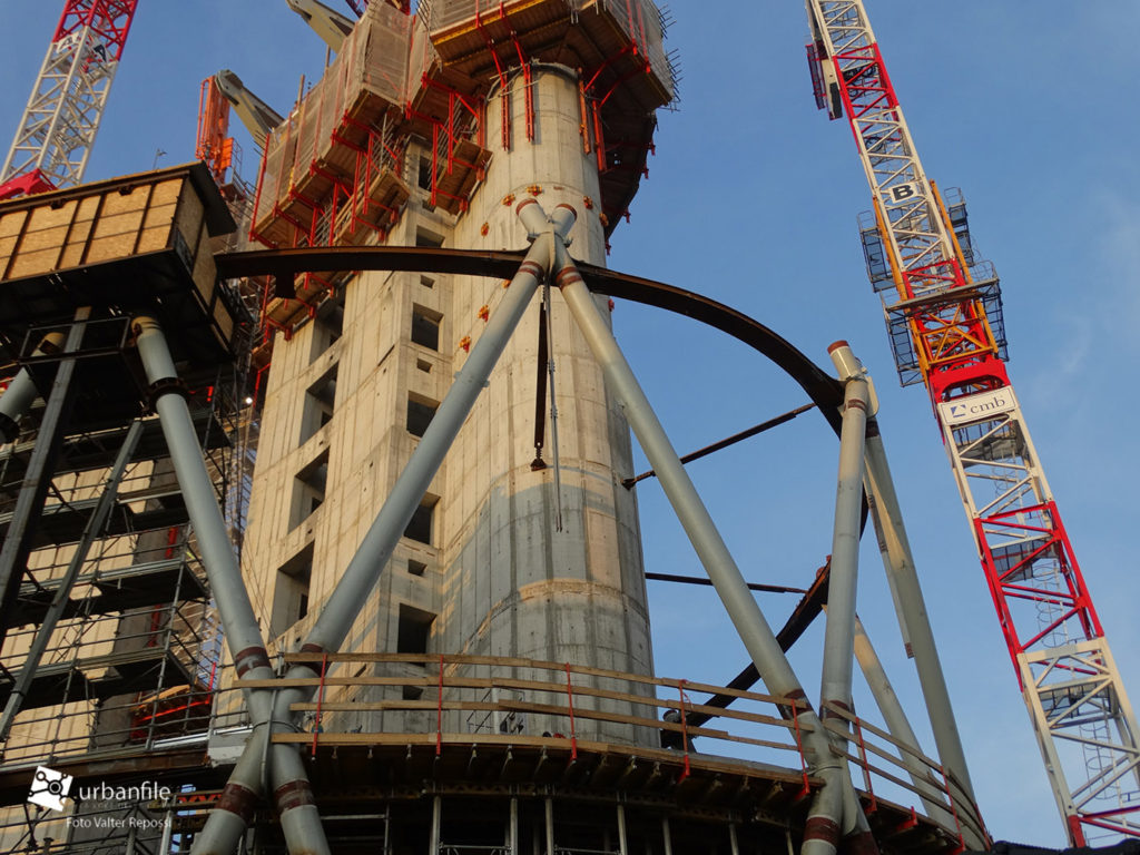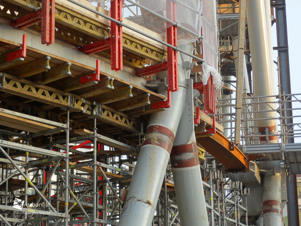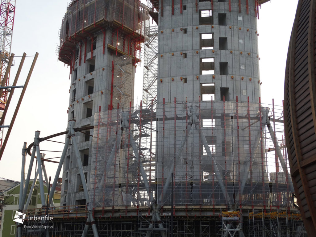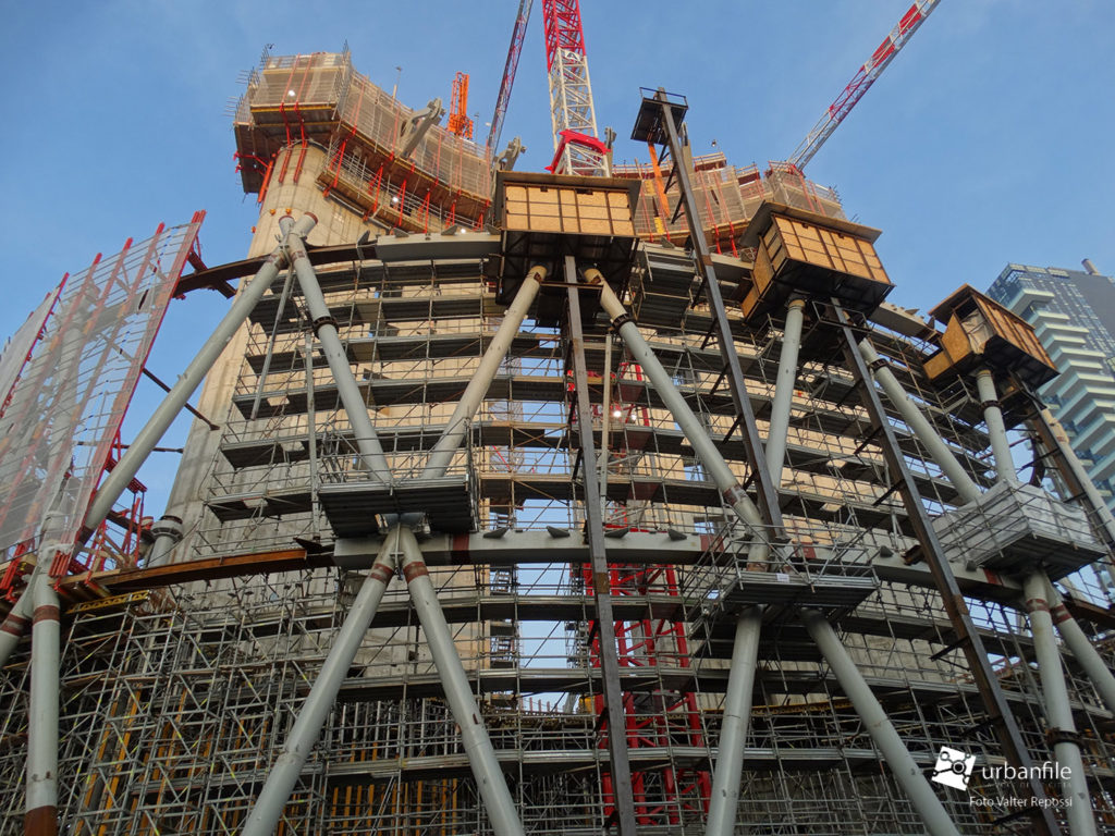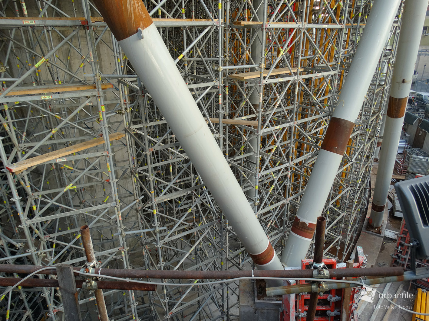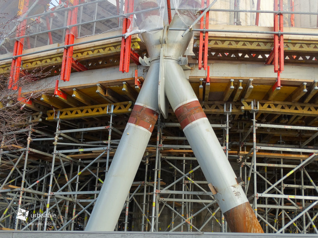 Data la complessità dell’edificio, la struttura pare avanzare veramente a rilento. Ogni giunto delle “losanghe” deve essere ben fissato e gli operai per lavorare al pezzo sono “costretti” a inserirsi in quelle specie di casette in legno che fungono da mini-casseri.