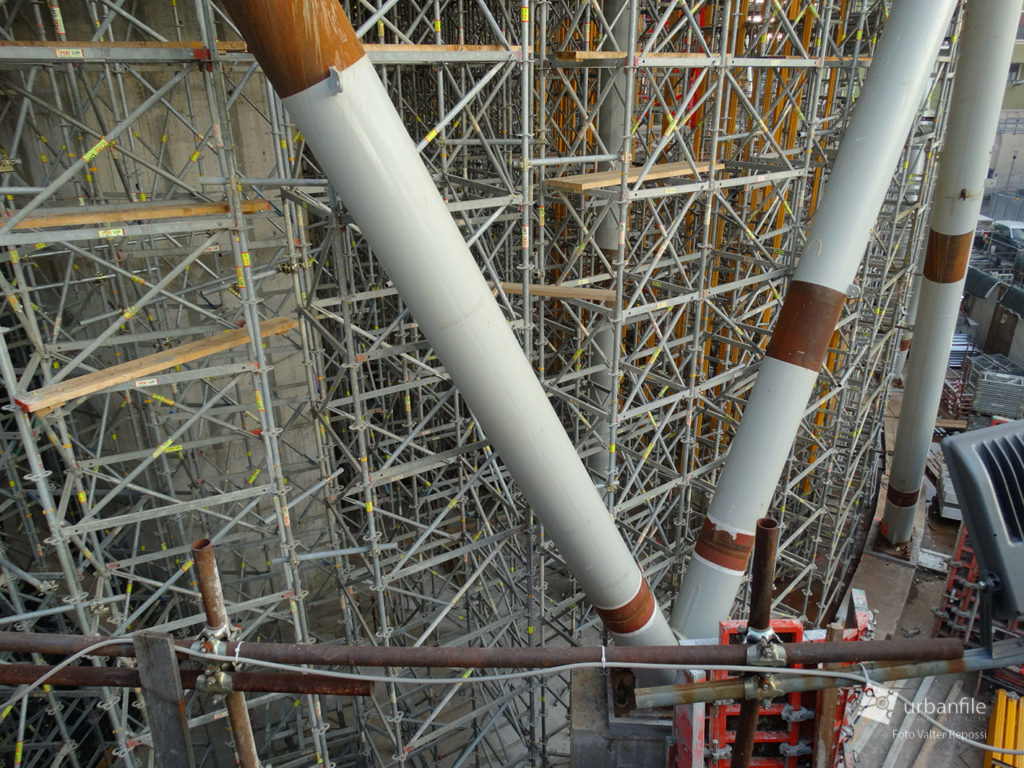 La struttura fa veramente impressione, soprattutto le travi poste a losanga che fungeranno da struttura portante e dove sarà applicato in seguito la facciata a vetri.