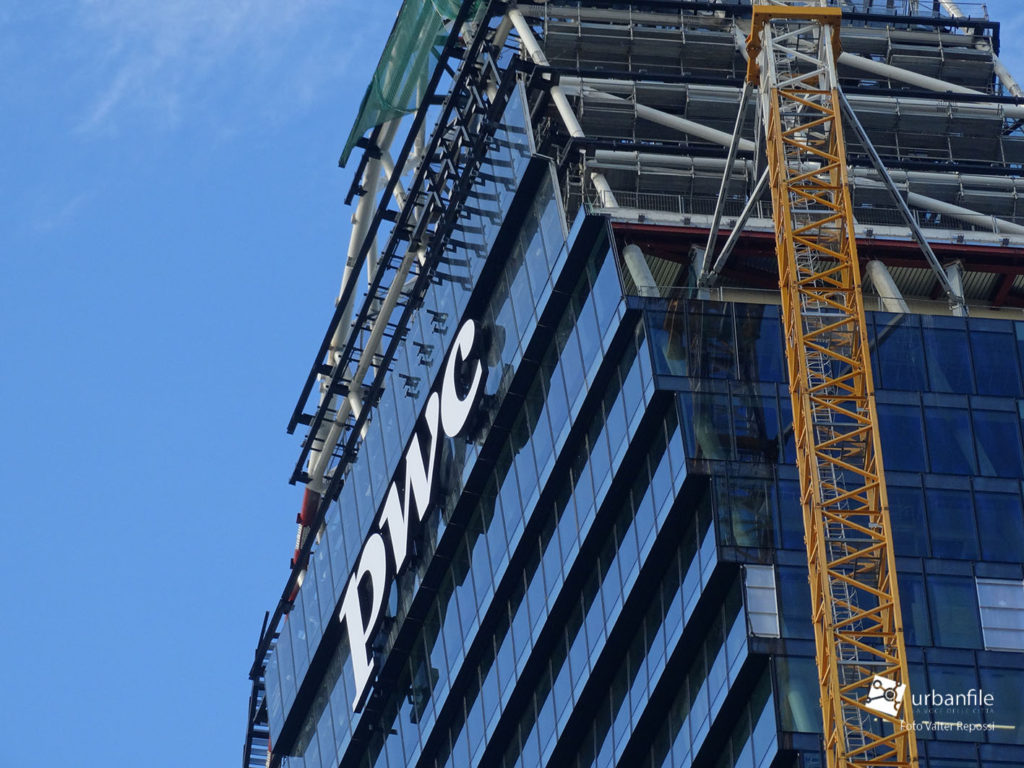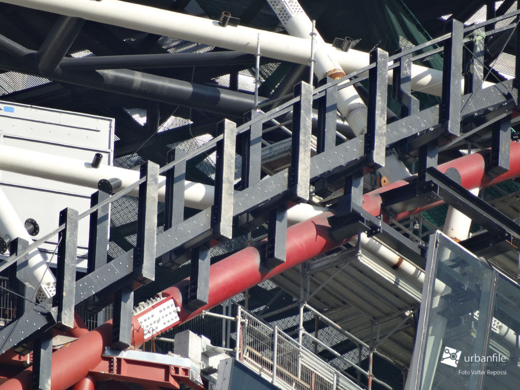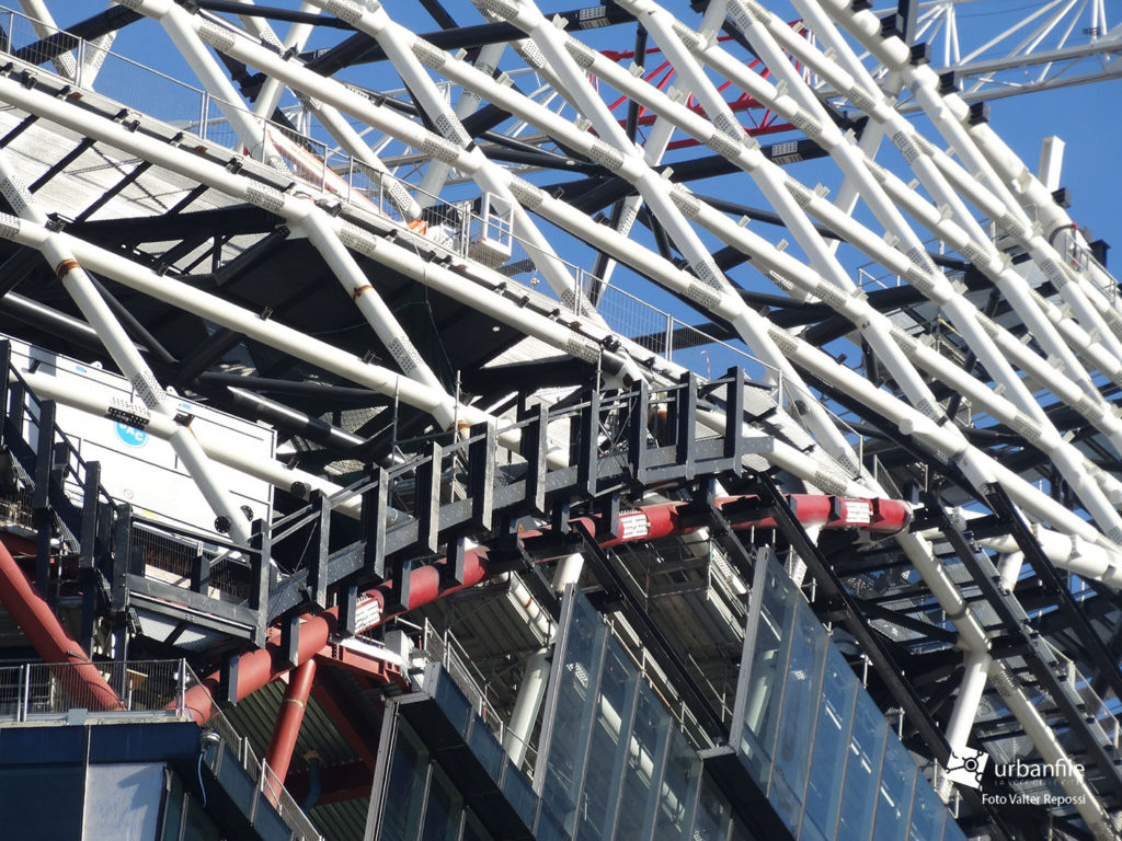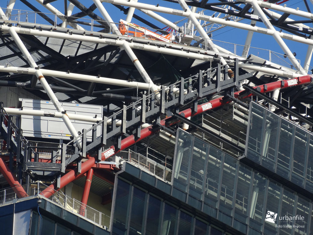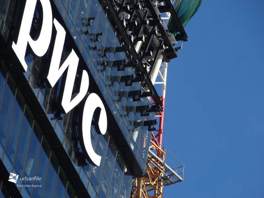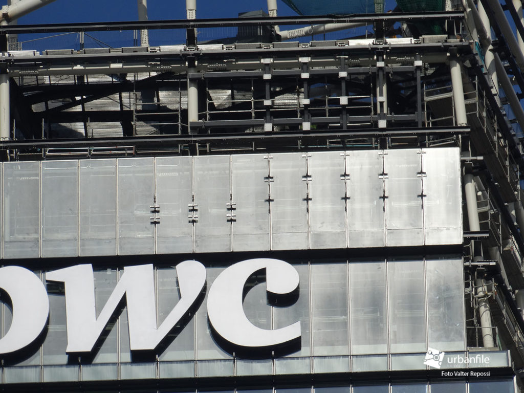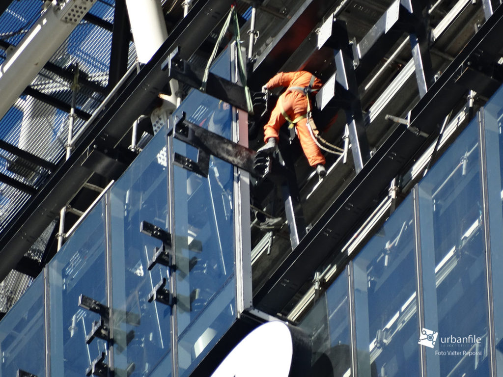 Nel frattempo prosegue il montaggio per la grande insegna. Come si vede dalle foto dettagliate scattate da Valter Repossi, la scritta è posta in una posizione molto delicata che richiede un particolare impegno da parte dei tecnici. Dopo il montaggio della scritta PWC fatta qualche settimana fa, ora tocca al pittogramma per completare il logo.