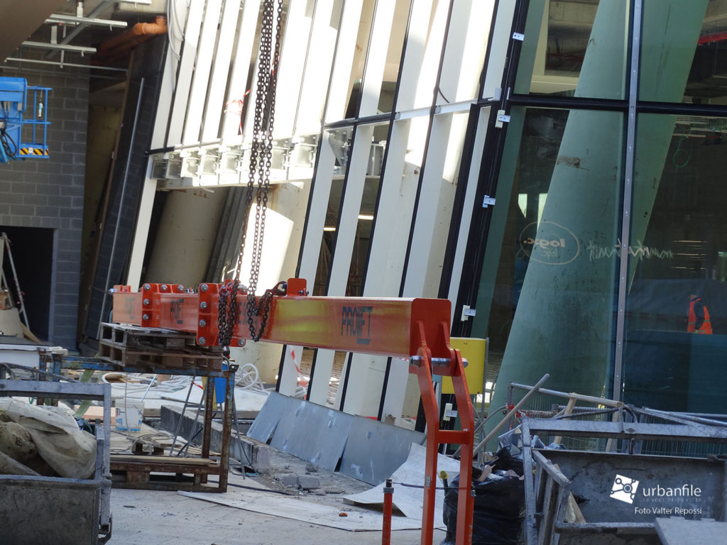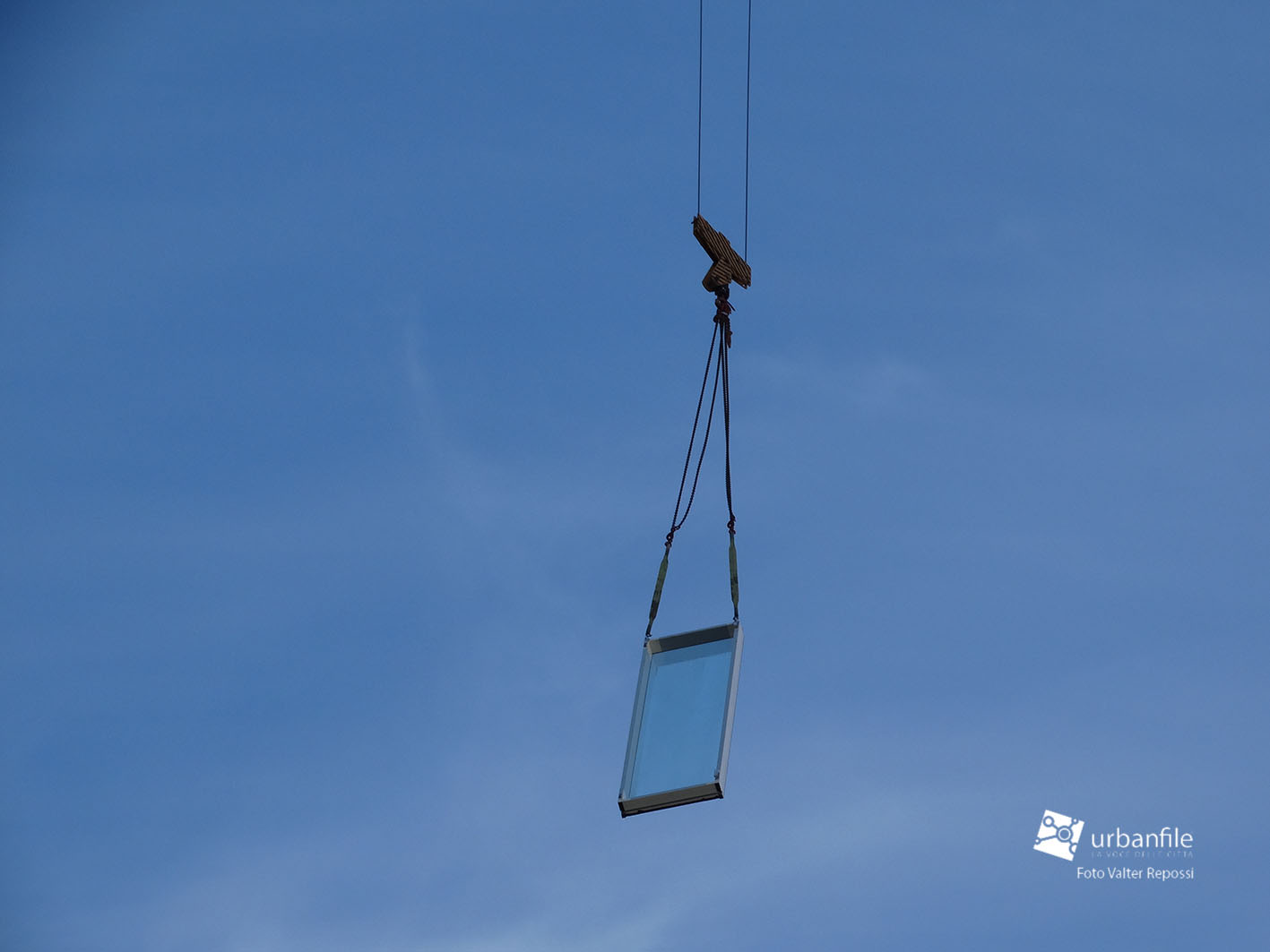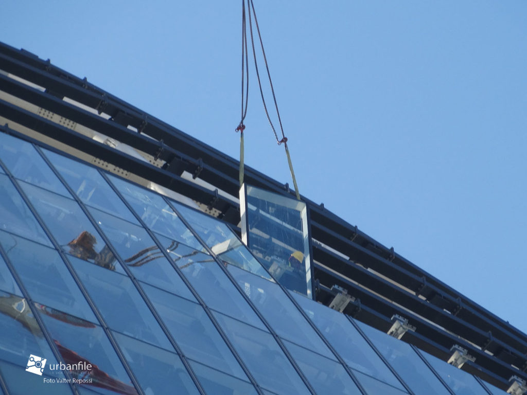 Nel frattempo possiamo anche ammirare il montaggio nella parte semisferica di una delle lastre di vetro che formano la facciata.