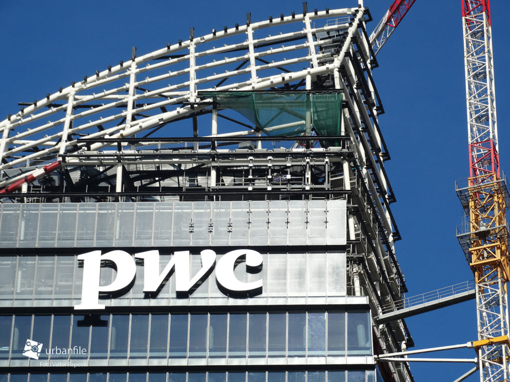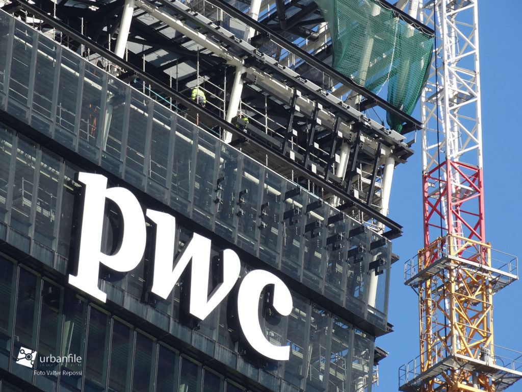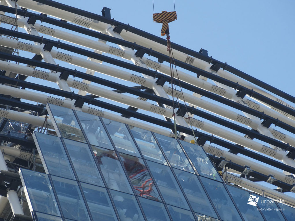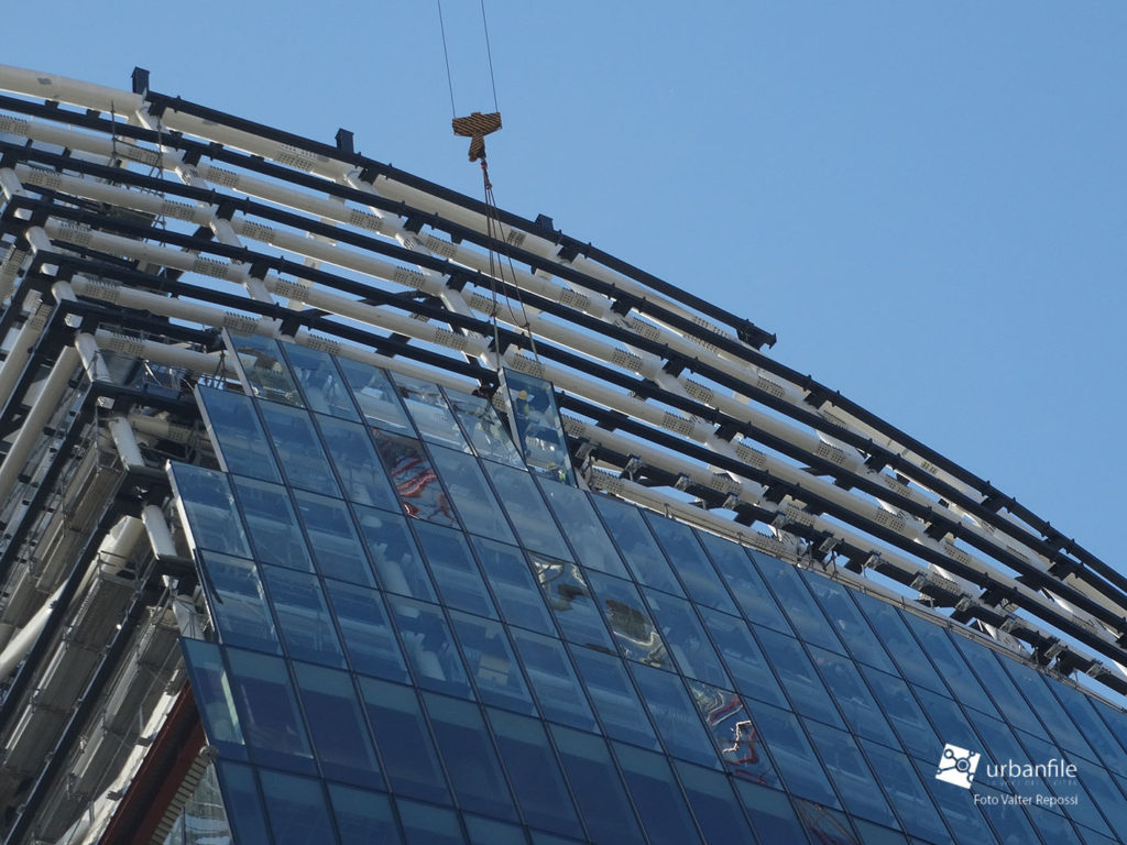 Prosegue il montaggio delle vetrate per la torre PWC-Curvo a Tre Torri nel quartiere di CityLife.