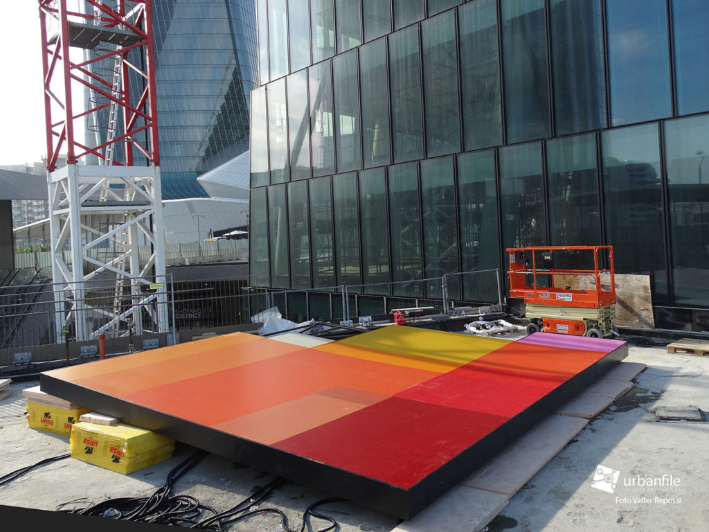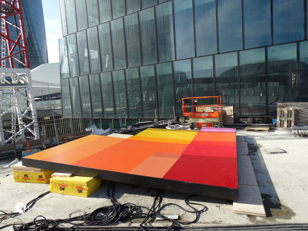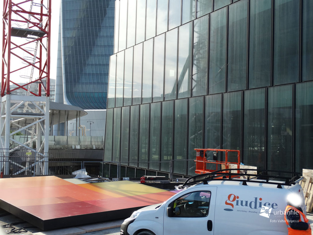 Il pittogramma nel frattempo è stato montato alla base del grattacielo e verrà issato a breve e agganciato alle banche poste sulla facciata della torre.