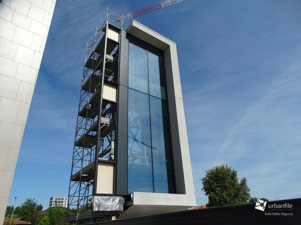 - Un corpo alto costituito da nove piani fuori terra, articolato attraverso la generazione di sfalsamenti, arretramenti e porzioni di edificio a ponte, resi possibili mediante l’adozione di importanti strutture di trasferimento in carpenteria metallica;