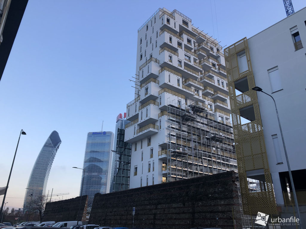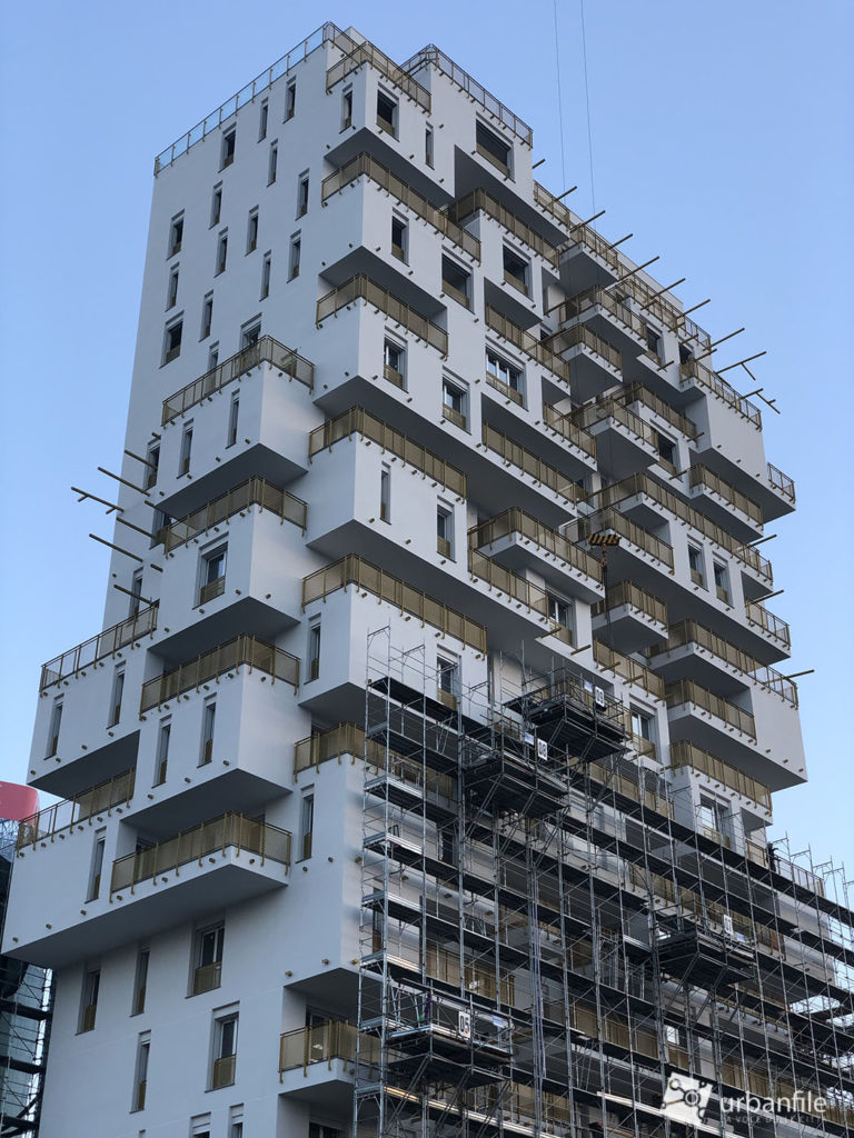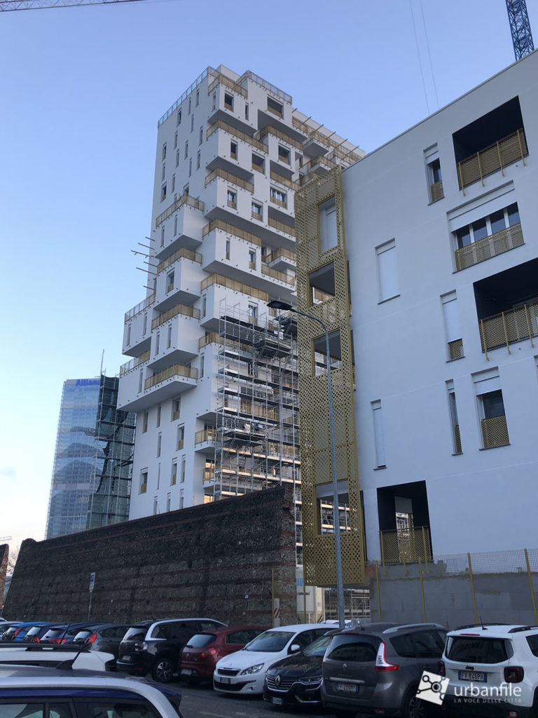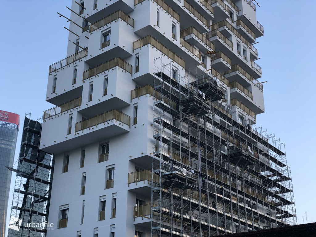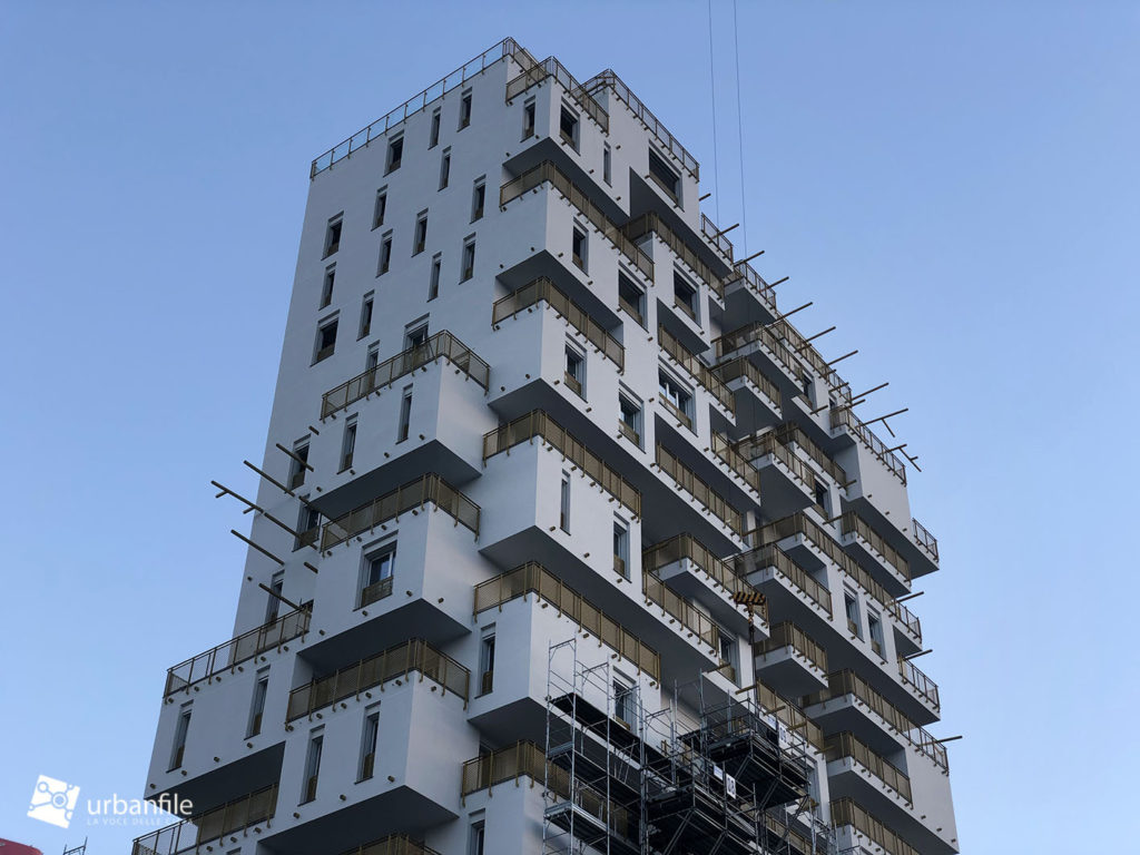 Mentre prosegue lo “spacchettamento” della torre, per poter installare la griglia di facciata, che caratterizzerà l’edificio, anche per gli edifici più bassi, si stanno completando le facciate.