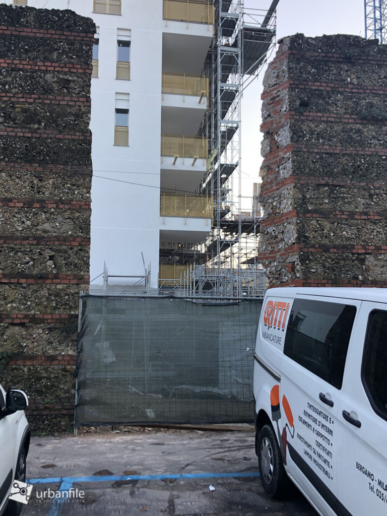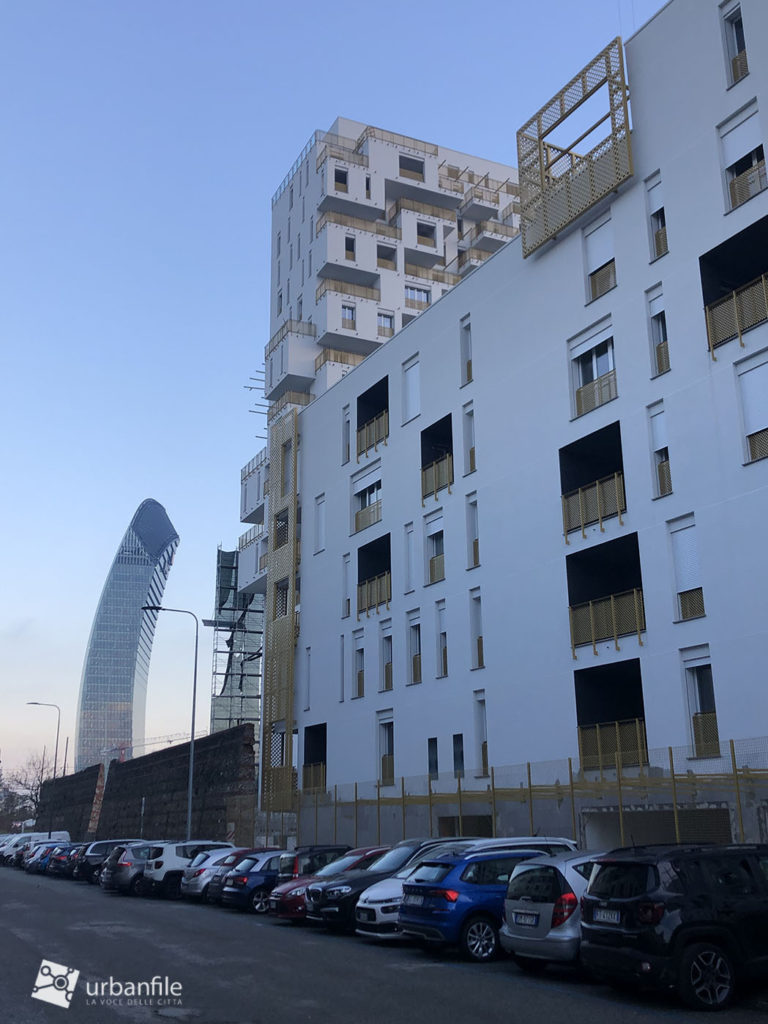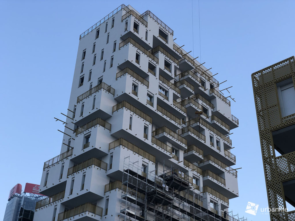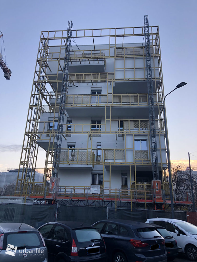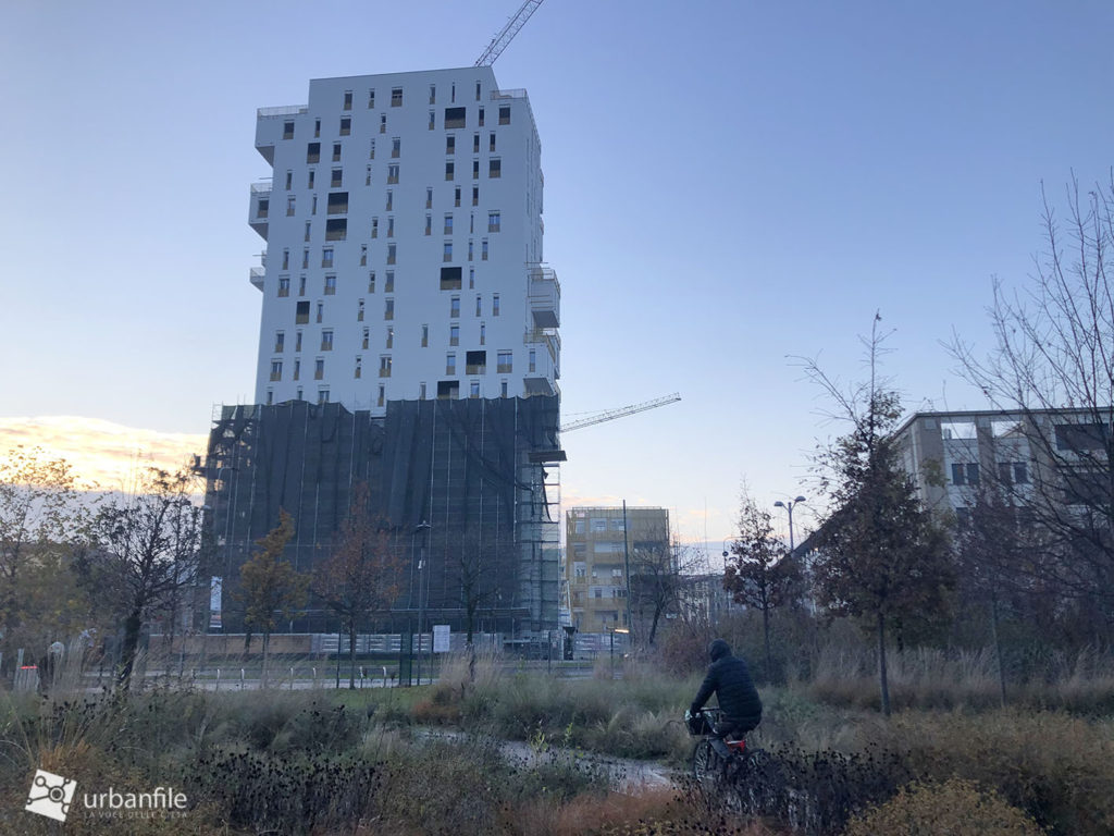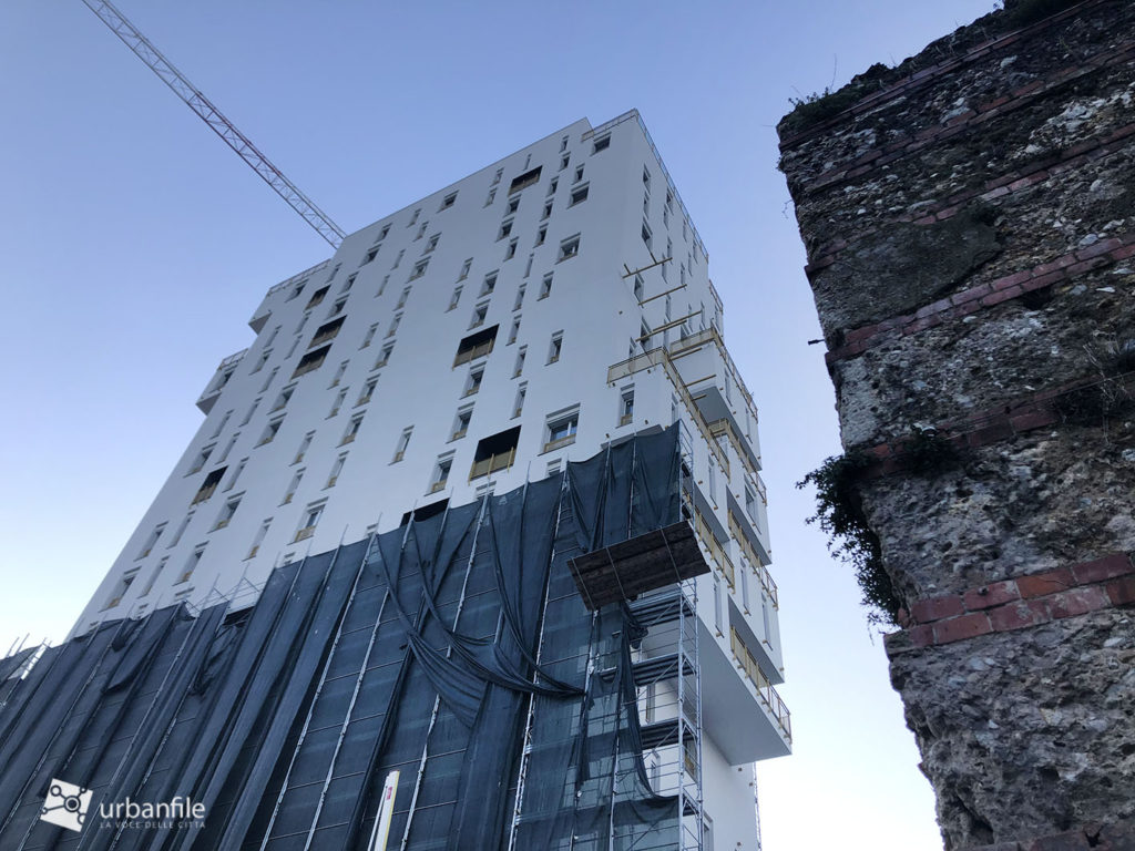 Mentre prosegue lo “spacchettamento” della torre, per poter installare la griglia di facciata, che caratterizzerà l’edificio, anche per gli edifici più bassi, si stanno completando le facciate.