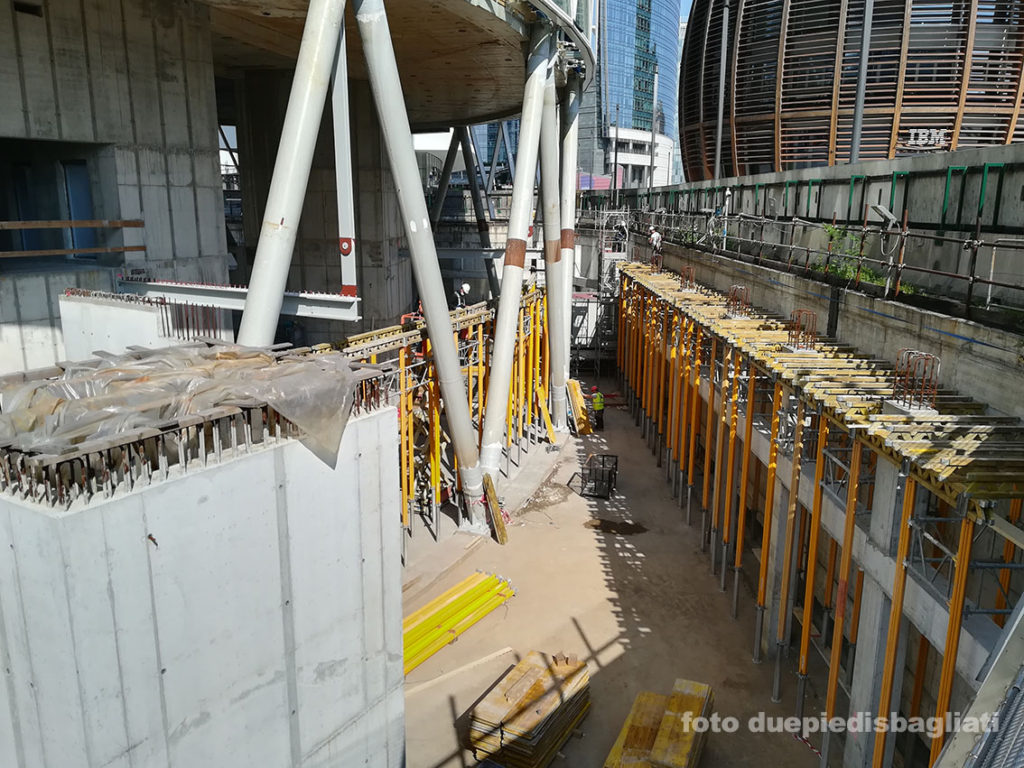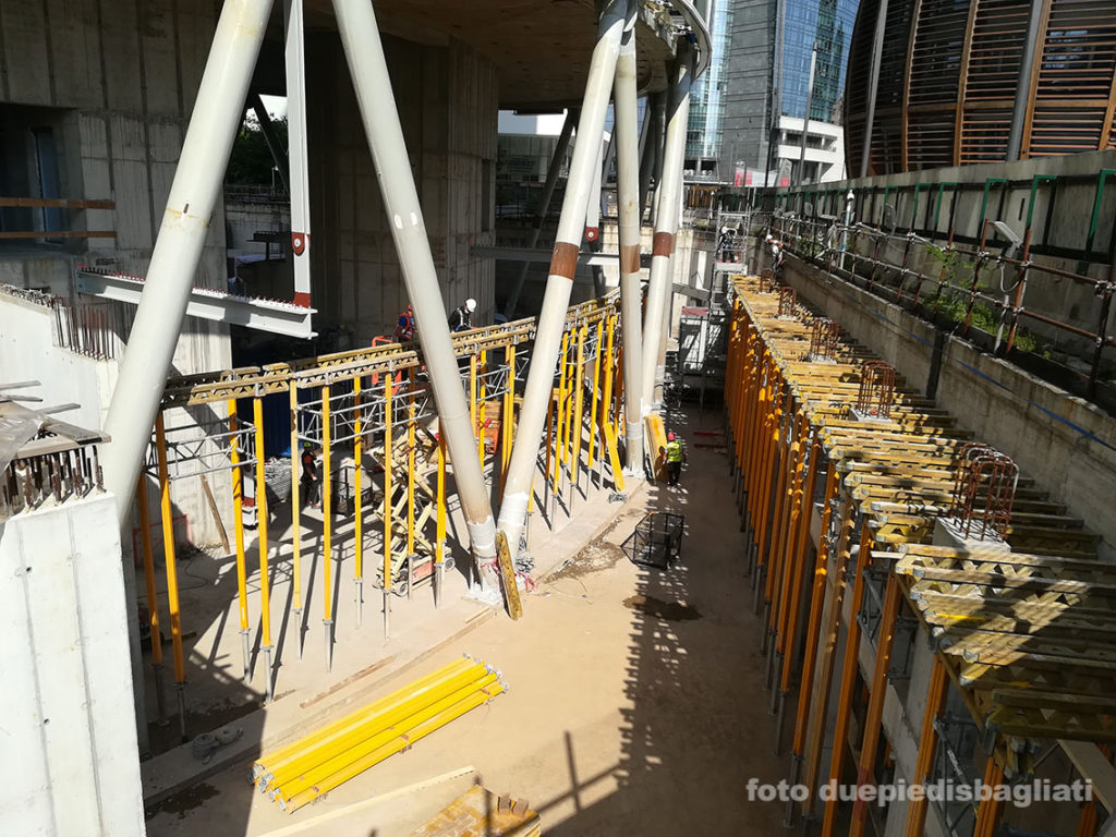 Oltre alla fase di montaggio per gli ultimi pezzi per formare l’ultimo anello della sommità e al rivestimento delle facciate, ora si comincia a realizzare la soletta che unirà il podio e le scalinate ai lati della passerella su via Melchiorre Gioia.